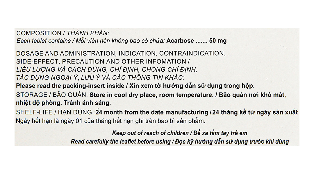 Hoạt chất: Acarbose 50mg.