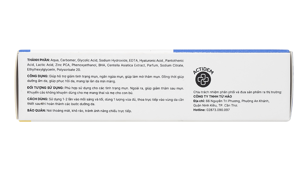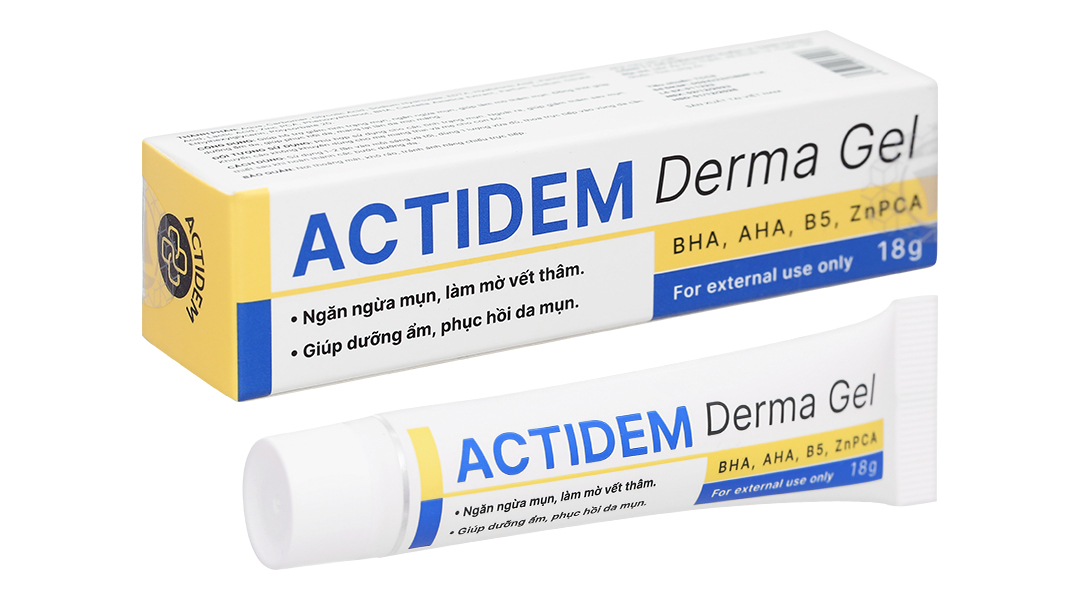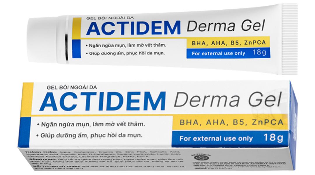 - Gel Actidem Derma là dòng sản phẩm chăm sóc da chuẩn y khoa với công năng chính giúp giảm các loại mụn ẩn, mụn viêm,… Sản phẩm được trải qua các cuộc khảo sát hàng loạt của đội ngũ chuyên gia, dược sĩ kiểm chứng chất lượng phục hồi, ngăn ngừa thâm sau mụn an toàn lành tính thích hợp với mọi loại da.