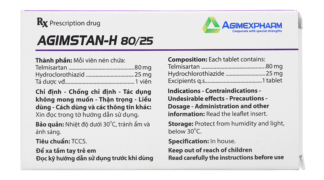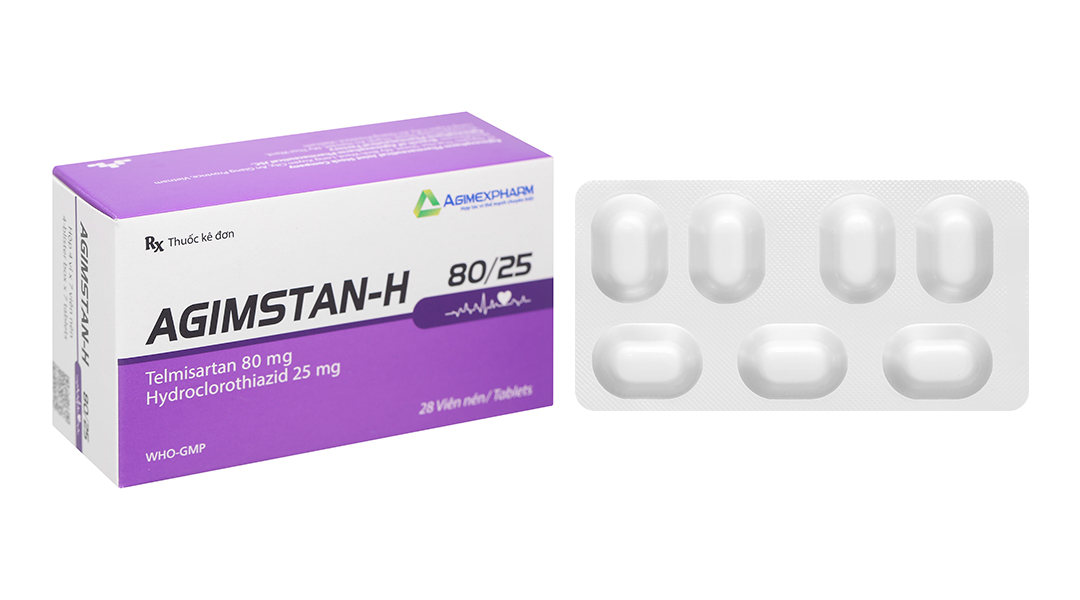 - Agimstan-H 80/25 có thành phần gồm hai hoạt chất telmisartan và hydroclorothiazid được sử dụng cùng với nhau ở dạng phối hợp liều uống một lần mỗi ngày để kiểm soát cao huyết áp. Tác dụng này được cho là kết quả của các tác dụng hỗ trợ lẫn nhau của cả hai thành phần giúp thuốc có tác dụng hiệp đồng trong hạ huyết áp, làm giảm huyết áp tốt hơn khi sử dụng từng thành phần riêng rẽ.