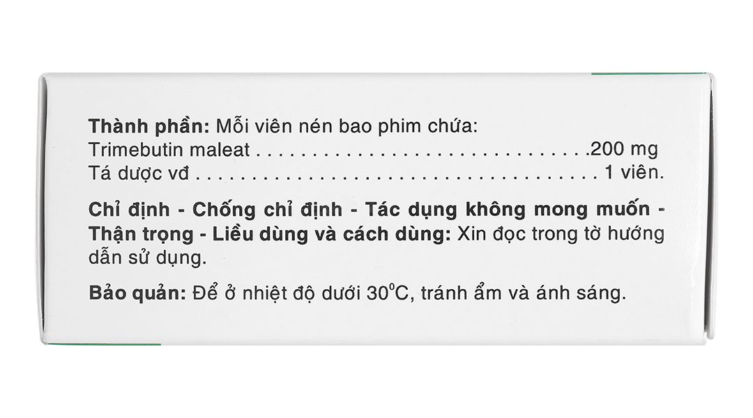 – Khả năng lái xe và vận hành máy mócThận trọng khi lái xe và vận hành máy móc vì thuốc có thể gây mệt mỏi, buồn ngủ, hoa mắt, chóng mặt, suy nhược, nhức đầu. – Tương tác thuốcTrimebutin có thể ảnh hưởng hấp thu và gia tăng tác dụng không mong muốn của tubocurarin. |