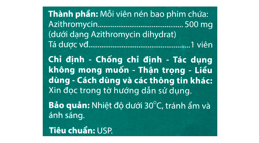 – Thận trọng khi sử dụngQuá mẫn: Cũng như với erythromycin và các macrolid khác, đã có báo cáo về các phản ứng dị ứng nghiêm trọng hiếm gặp, bao gồm phù mạch và sốc phản vệ (hiếm khi tử vong), và các phản ứng trên da bao gồm ngoại ban mụn mủ toàn thân cấp tính (AGEP), hội chứng Stevens – Johnson (SJS), và hoại tử biểu bì nhiễm độc (TEN) (hiếm khi tử vong) và phản ứng thuốc gây tăng bạch cầu ái toan ưa eosin và triệu chứng toàn thân (DRESS). Một vài phản ứng với azithromycin này đã gây ra những triệu chứng tái phát và cần phải được theo dõi và an điều trị lâu hơn. Nếu bị phản ứng dị ứng, cần ngừng ngay thuốc và dùng liệu pháp điều trị phù hợp. Bác sỹ cần biết các phản ứng dị ứng có thể xuất hiện lại khi đã ngừng điều trị triệu chứng. Nhiễm độc gan: Vì gan là đường thải trừ chính của azithromycin, nên việc sử dụng azithromycin cần phải thận trọng ở bệnh nhân mắc bệnh gan nặng. Đã có báo cáo về chức năng gan bất thường, viêm gan, vàng da do tắc mật, hoại tử gan và suy gan, một số trường hợp này đã dẫn đến tử vong. Khi thấy có các dấu hiệu và triệu chứng viêm gan, phải ngưng dùng azithromycin ngay lập tức. Hẹp môn vị phì đại ở trẻ nhỏ: Trong quá trình theo dõi việc sử dụng azithromycin trên trẻ sơ sinh (dùng thuốc đến 42 ngày tuổi), đã có báo cáo về trường hợp mắc hẹp môn vị phì đại ở trẻ nhỏ. Cha mẹ và người trông trẻ cần được hướng dẫn thông báo ngay cho bác sỹ nếu trẻ nôn hoặc cáu gắt khi cho ăn. Thuốc có nguồn gốc cựa lõa mạch (ergot): Ở bệnh nhân đang dùng thuốc có nguồn gốc cựa lõa mạch (ergot), khả năng bị ngộ độc ergotin sẽ tăng lên khi dùng phối hợp với các kháng sinh họ macrolid. Không có dữ liệu về khả năng tương tác giữa cựa lõa mạch (ergot) và azithromycin. Tuy nhiên, về mặt lý thuyết có thể xảy ra ngộ độc ergotin, do đó không nên dùng phối hợp các thuốc có nguồn gốc cựa lõa mạch (ergot) với azithromycin. Bội nhiễm: Cũng như với bất kỳ chế phẩm kháng sinh nào, cần phải quan sát các dấu hiệu bội nhiễm của vi sinh vật không nhạy cảm, bao gồm cả nấm. Tiêu chảy do Clostridium difficile: Tiêu chảy do Clostridium difficile (Clostridium difficile associated diarrhea – CDAD) đã được báo cáo khi sử dụng hầu hết các chất kháng khuẩn, bao gồm azithromycin, và mức độ nghiêm trọng có thể từ tiêu chảy nhẹ đến viêm đại tràng gây tử vong. Điều trị bằng các chất kháng khuẩn sẽ làm thay đổi quần thể vi sinh tự nhiên của ruột dẫn tới sự phát triển quá mức của C.difficile. C.difficile sản sinh ra độc tố A và B góp phần phát triển CDAD. Các chủng sản sinh siêu độc tố của C. difficile làm tăng tỷ lệ mắc bệnh và tử vong, do các tình trạng nhiễm khuẩn này có thể sẽ kháng thuốc kháng sinh và có thể cần phải làm thủ thuật cắt bỏ đại tràng. CDAD phải được xem xét ở tất cả các bệnh nhân có biểu hiện tiêu chảy sau khi dùng kháng sinh. Cần hỏi kỹ bệnh sử vì có báo cáo CDAD xảy ra sau hơn 2 tháng sau khi dùng các chất kháng sinh. Suy thận: Ở bệnh nhân suy thận nặng (GFR < 10 ml/phút), quan sát thấy tăng 33% nồng độ toàn thân của azithromycin (xem mục Các đặc tính dược động học). Kéo dài khoảng QT: Đã thấy tình trạng kéo dài thời gian tái cực của cơ tim và khoảng QT, gây nguy cơ loạn nhịp tim và xoắn đỉnh khi dùng các macrolid, bao gồm azithromycin (xem mục Tác dụng không mong muốn). Người kê toa cần xem xét nguy cơ kéo dài khoảng QT có thể gây tử vong khi cân nhắc nguy cơ và lợi ích của azithromycin cho các nhóm có nguy cơ cao bao gồm: