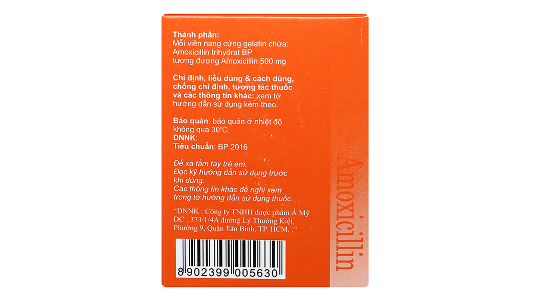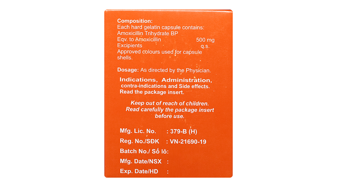 Hoạt chất: Amoxicillin trihydrate tương đương Amoxicillin 500mg.