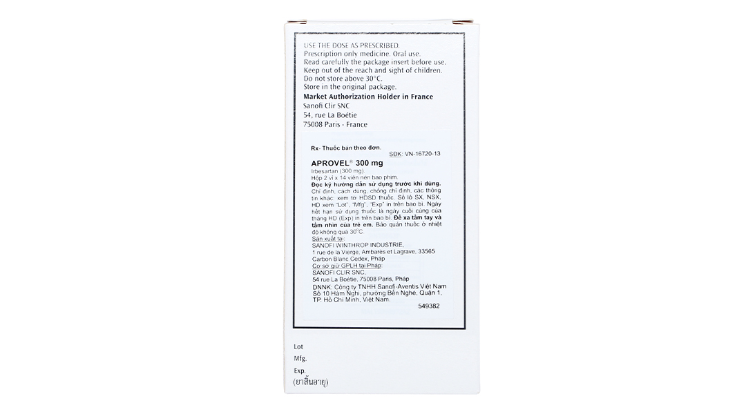 - Cần báo cho bác sĩ biết nếu bạn có thai, hoặc có thể có thai. Thông thường bác sĩ sẽ khuyên bạn ngưng dùng Aprovel trước khi có thai hoặc ngay khi bạn biết mình có thai và sẽ khuyên bạn dùng thuốc khác thay thế cho Aprovel.