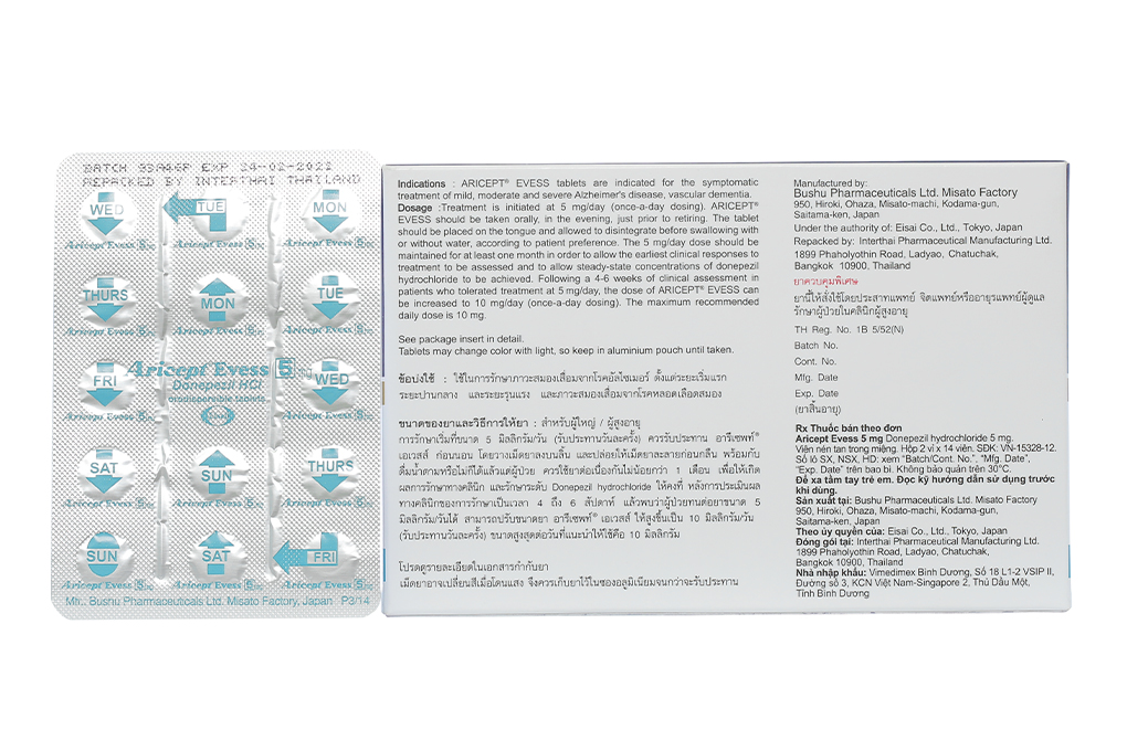 - Việc điều trị bắt đầu ở liều 5 mg/ngày (liều 1 lần mỗi ngày). ARICEPT EVESS được dùng bằng đường uống vào buổi tối ngay trước khi ngủ. Phải đặt viên nén vào lưỡi và để cho viên rã ra trước khi nuốt hoặc chiêu với nước, tùy theo ý muốn của người bệnh. Liều 5 mg/ngày nên được duy trì ít nhất là một tháng để có thể đánh giá những đáp ứng lâm sàng sớm nhất đối với việc điều trị cũng như giúp đạt được nồng độ donepezil hydrochloride ở trạng thái ổn định. Sau 4-6 tuần đánh giá lâm sàng ở bệnh nhân điều trị ở liều 5 mg/ngày, có thể tăng liều ARICEPT EVESS lên đến 10 mg/ngày (liều 1 lần mỗi ngày). Liều tối đa/ngày được khuyến cáo là 10 mg. Các liều lớn hơn 10 mg/ngày chưa được nghiên cứu trong thử nghiệm lâm sàng.