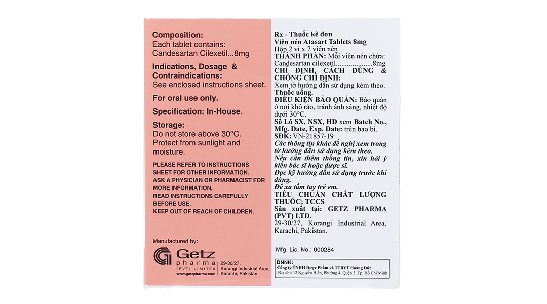 - Hoạt chất: Candesartan Cilexetil 8,0mg.