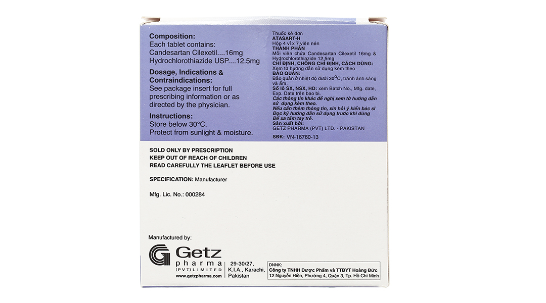 – Hoạt chất: Candesartan Cilexetil 16mg & Hydrochlorothiazide 12,5mg