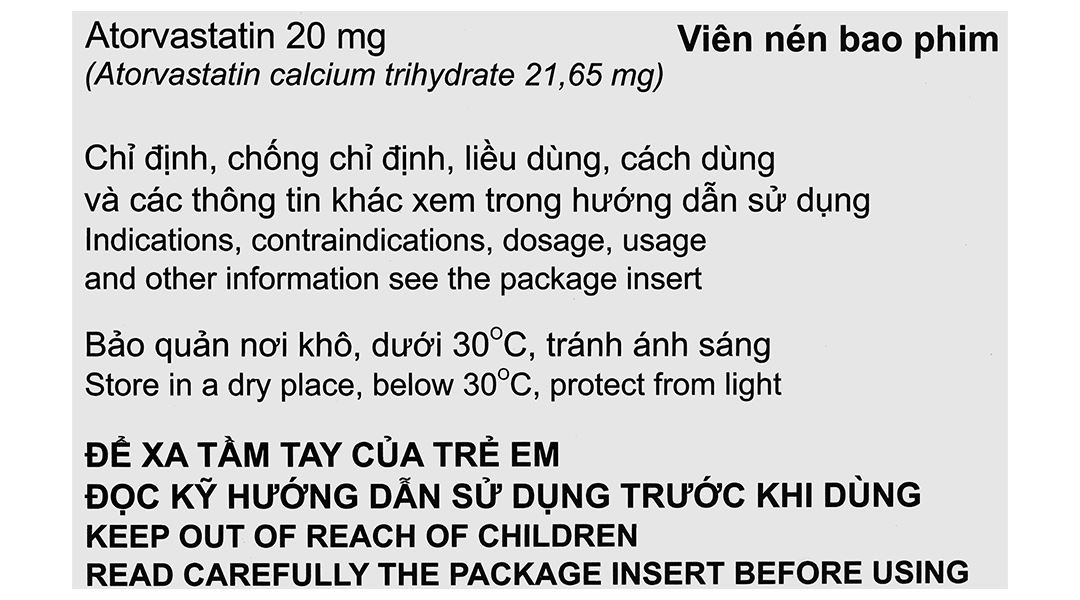 - Thành phần hoạt chất: Atorvastatin 20 mg (dưới dạng atorvastatin calci trihydrat)