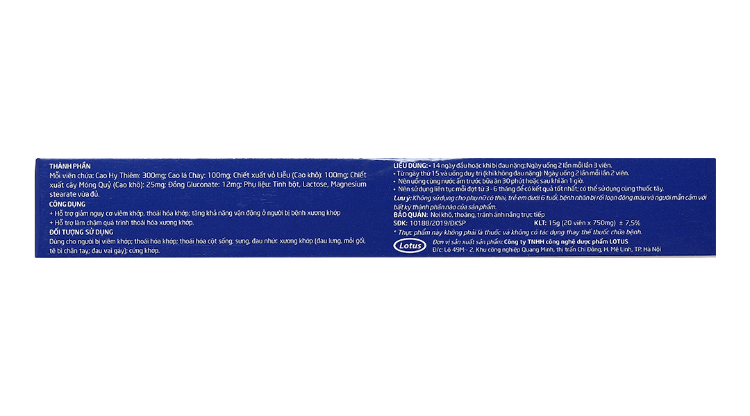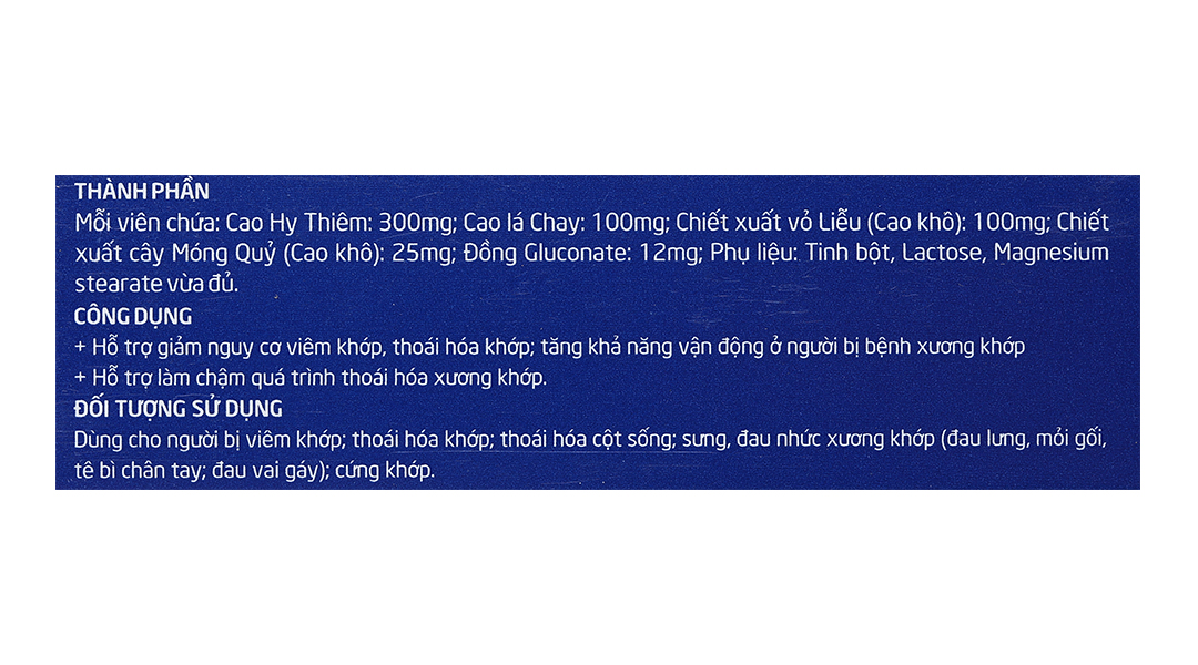 Đối tượng sử dụngNgười bị viêm khớp, thoái hóa khớp, thoái hóa cột sống: sưng, đau nhức xương khớp