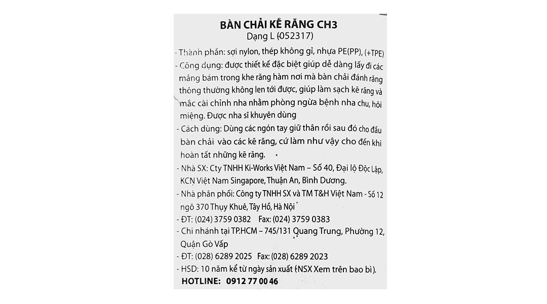 - Bàn chải kẽ răng Okamura CH3 được thiết kế để dễ dàng tiếp cận các khoảng trống nhỏ nhất giữa các kẽ răng mà không gây ra bất kỳ tổn thương nào. Với sợi lông siêu mềm và mỏng, bàn chải giúp làm sạch răng hiệu quả chỉ với một lần đưa vào và rút ra.