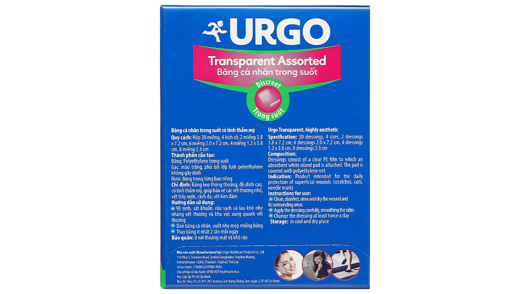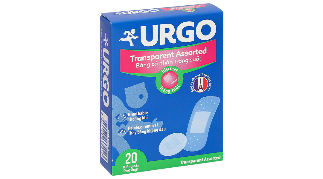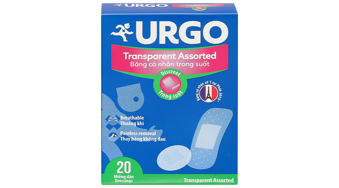 Băng cá nhân Urgo bảo đảm được sự thông thoáng cho vết thương, độ bám dính cao, thiết kế trong suốt có tính thẩm mỹ, giúp bảo vệ các vết thương nhỏ, vết trầy xước, rách da, vết kim đâm. Sản phẩm được làm từ chất liệu co giãn tốt, gạc mềm phủ lưới Polyethylene không gây dính hoặc đau khi gỡ băng, dễ dàng sử dụng và tháo bỏ.