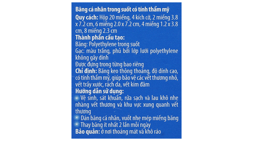 - Hộp 20 miếng với 4 kích thước: 2 miếng 3.8 x 7.2 cm, 6 miếng 2.0 x 7.2 cm, 4 miếng 1.2 x 3.8 cm, 8 miếng 2.3 cm.
