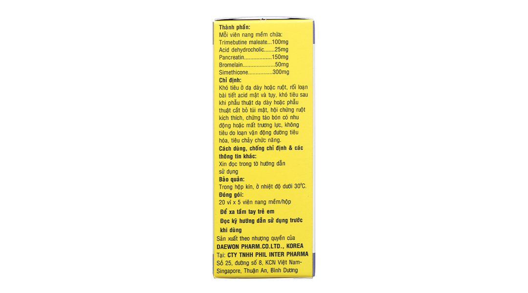 Hoạt chấtSimethicon, Pancreatin, Bromelain, Trimebutin, Acid dehydrocholic