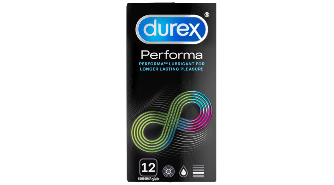 Bao cao su Durex Performa với công thức mới lạ chứa Benzocain 5% giúp kéo dài thời gian hưng phấn, giúp cuộc yêu được kéo dài hơn.