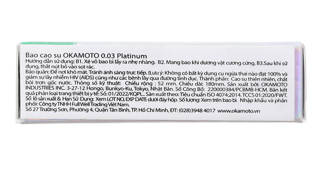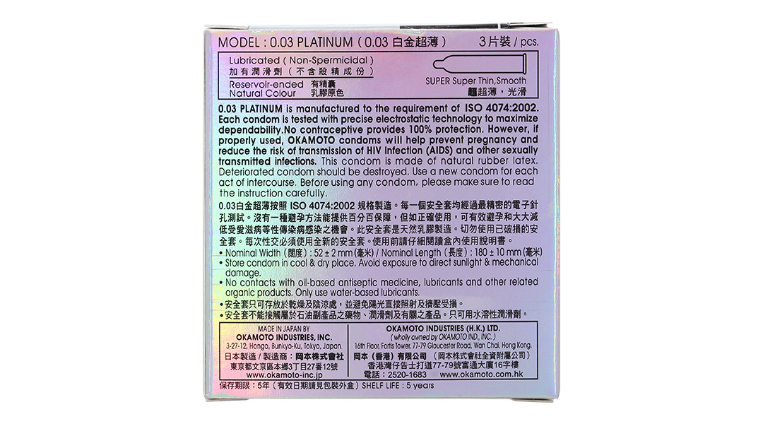 Bao cao su Okamoto 0.03 Platinum là loại bao cao su cao cấp, cực siêu mỏng chỉ với 0.03mm, được làm bằng chất liệu cao su thiên nhiên, sản phẩm được sản xuất theo công nghệ mới của Nhật Bản đảm bảo độ an toàn rất cao.