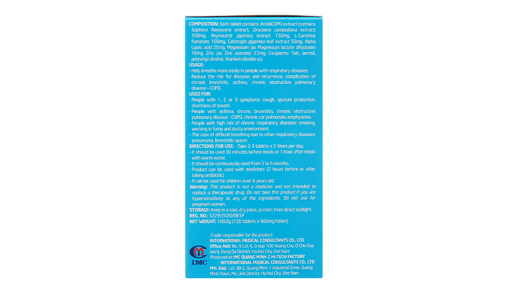 - Cao AntidiCOPD (chứa cao Khổ sâm bắc, cao Huyết giác): Cao AntidiCOPD là sự kết hợp hai thảo dược có hoạt tính cao: Sophora flavescens (Dã hòe/ Khổ sâm) và Dracaena cambodiana (Huyết giác).