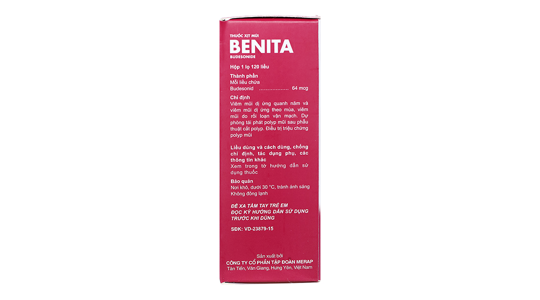 - Sinh khả dụng toàn thân của Budesonid trong BENITA dạng định liều là 33%, hầu hết trong số đó hấp thu qua niêm mạc mũi. Ở người lớn, nồng độ huyết tương tối đa sau khi sử dụng 256microgam Budesonid trong BENITA là 0,64nmol/L trong vòng 0,7 giờ. Diện tích dưới đường cong biểu diễn nồng độ thuốc theo thời gian (AUC) sau khi dùng 256microgam Budesonid từ BENITA là 2,7nmol x giờ/L ở người lớn và 5,5nmol x giờ/L ở trẻ em, điều này cho thấy ở trẻ em, sự tiếp xúc toàn thân với glucocorticosteroid cao hơn.