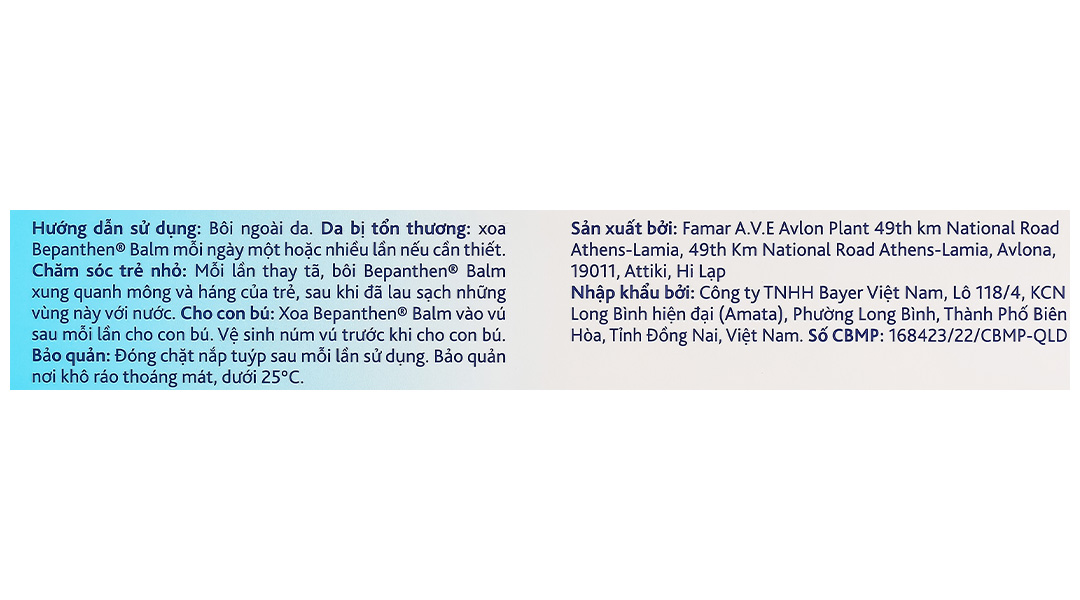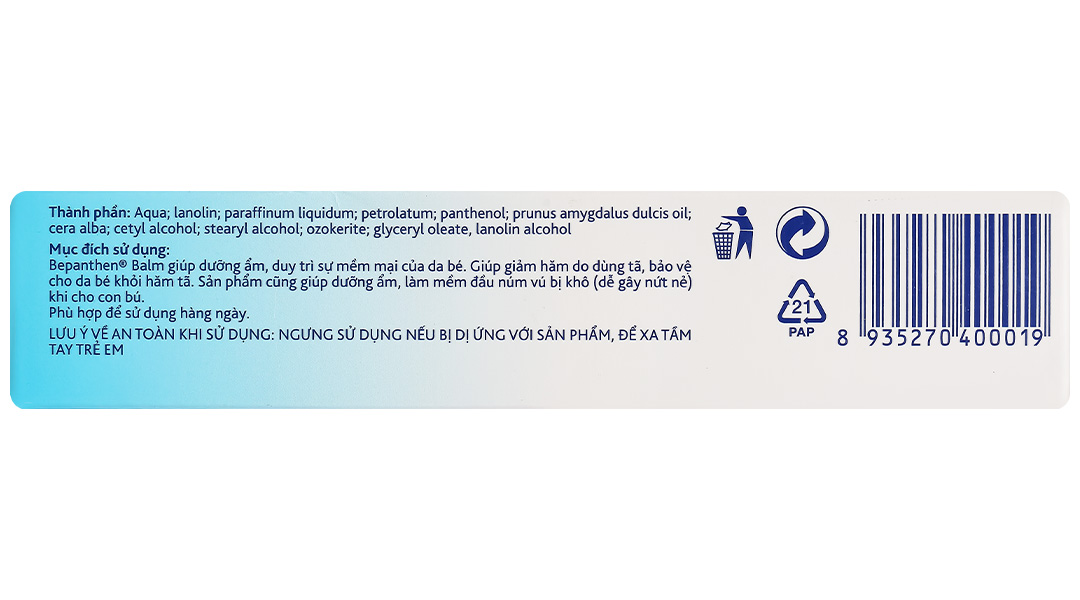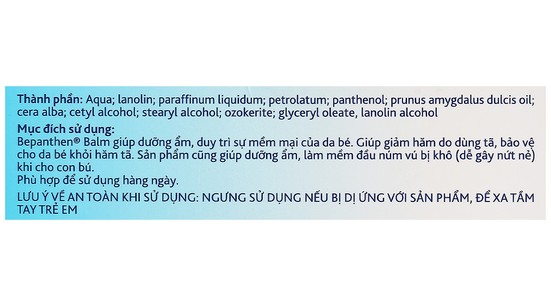 Thành phầnAqua; lanolin; paraffinum liquidum; petrolatum; panthenol; prunus amygdalus dulcis oil; cera alba; cetyl alcohol; stearyl alcohol; ozokerite; glyceryl oleate, lanolin alcohol.