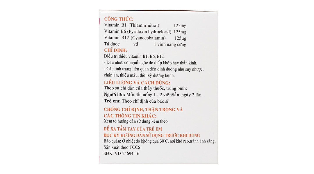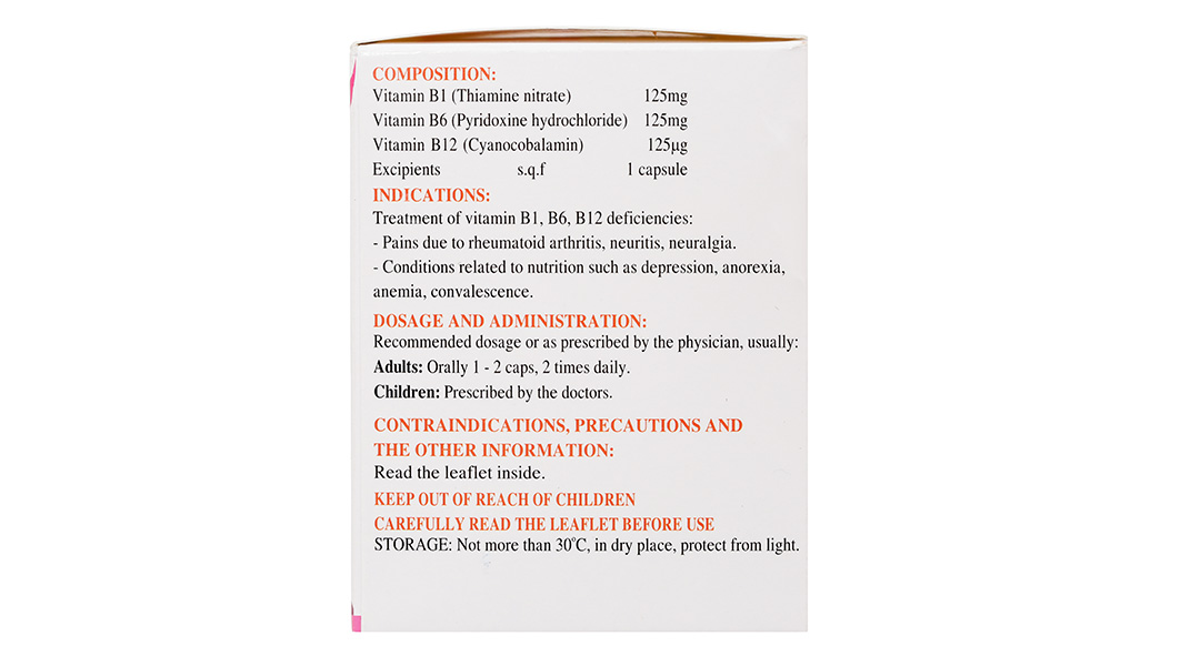 – Thận trọng khi sử dụngThận trọng với người có cơ địa dị ứng (hen, eczema). Liên quan vitamin B6: dùng liều 200mg mỗi ngày, kéo dài trên 30 ngày có thể gây hội chứng lệ thuộc vitamin B6, kéo dài trên 2 tháng có thể biểu hiện độc tính thần kinh (như bệnh thần kinh ngoại vi nặng và bệnh thần kinh cảm giác nặng). – Thai kỳ và cho con búKhông dùng cho phụ nữ có thai và cho con bú vì có thể gây hội chứng lệ thuộc vitamin B6 ở trẻ sơ sinh (liên quan đến vitamin B6 khi dùng liều cao). – Khả năng lái xe và vận hành máy mócKhông gây ảnh hưởng đến người lái xe và vận hành máy móc. – Tương tác thuốc* Liên quan đến vitamin B6 Pyridoxin làm giảm tác động của levodopa trong điều trị bệnh Parkinson, liều pyridoxin 200 mg/ngày có thể gây giảm 40 – 50 % nồng độ phenytoin và phenobarbital trong máu người bệnh. Pyridoxin làm nhẹ bớt trầm cảm ở phụ nữ uống thuốc tránh thai. Hydralazin, isoniazid, penicillamine, thuốc uống tránh thai làm tăng nhu cầu về pyridoxin. * Liên quan đến vitamin B12 Neomycin, acid aminosalicylic, chất đối kháng histamin H2 và colchicin làm giảm sự hấp thu của vitamin B12. Cloramphenicol làm giảm tác dụng của vitamin B12 trong điều trị bệnh thiếu máu. |