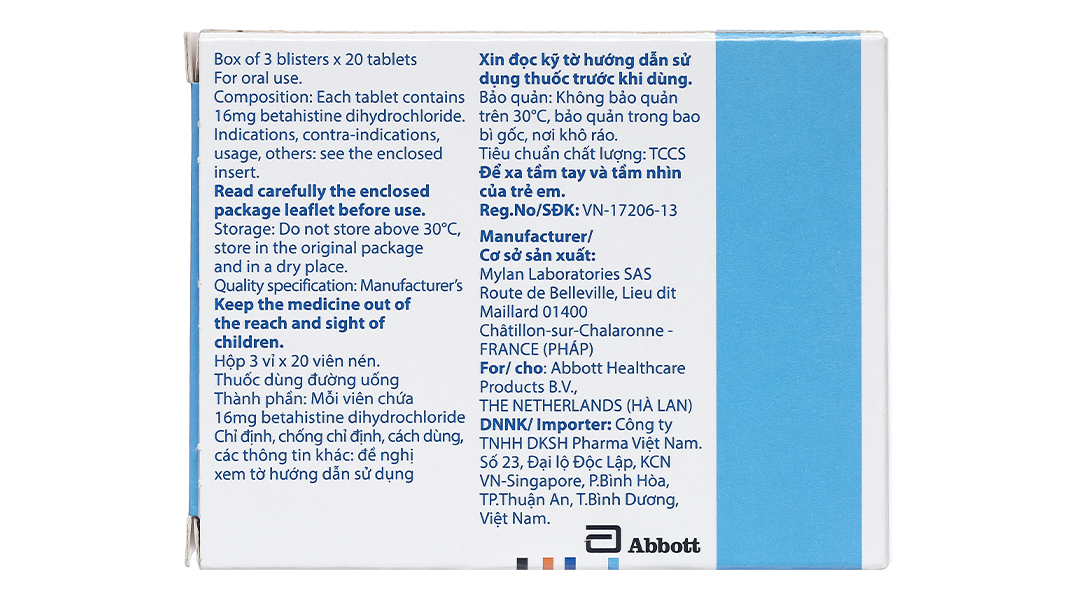 - Khi uống, Betahistine hấp thu mạnh và hầu như hoàn toàn qua tất cả các đoạn của ống tiêu hóa. Sau khi hấp thu, thuốc này sẽ chuyển hóa nhanh và hầu như hoàn toàn để cho 2-pyridylacetic acid mất hoạt tính dược lý. Nồng độ betahistine trong huyết tương rất thấp.