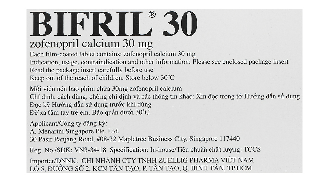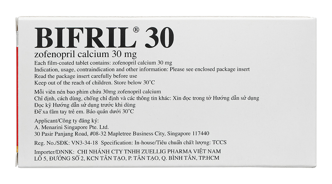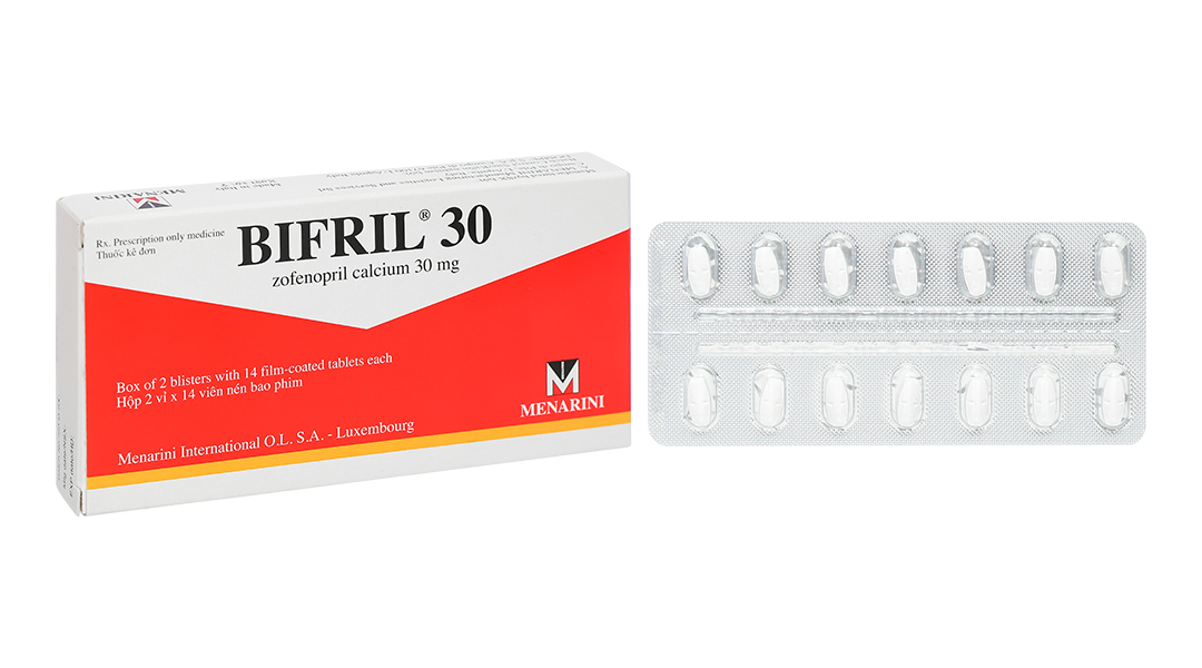 Phụ nữ cho con bú: Do chưa có thông tin đầy đủ liên quan đến việc sử dụng Bifril trong giai đoạn cho con bú, Bifril không được khuyến cáo cho đối tượng này. Nên sử dụng một phác đồ thay thế khác với dữ liệu độ an toàn trên phụ nữ có thai đã được nghiên cứu đầy đủ, đặc biệt trong giai đoạn nuôi dưỡng trẻ mới sinh hoặc sinh non. – Khả năng lái xe và vận hành máy mócChưa có nghiên cứu về tác động của Bifril trên khả năng vận hành máy móc, tàu xe. Khi lái xe hoặc sử dụng máy móc, cần lưu ý rằng, có thể xuất hiện các triệu chứng như ngủ gà, chóng mặt hoặc mệt mỏi. – Tương tác thuốcTương tác không khuyến cáo sử dụng: Thuốc lợi tiểu giữ kali hoặc thuốc bổ sung kali: Thuốc ức chế men chuyển làm giảm mức độ mất kali do thuốc lợi tiểu. Các thuốc lợi tiểu giữ kali như spironolacton, triamteren, hoặc amilorid, các thuốc bổ sung kali, hoặc các chất thay thế muối có chứa kali có thể dẫn đến tình trạng tăng kali máu quá mức. Nếu đã ghi nhận tình trạng hạ kali máu và cần sử dụng đồng thời các thuốc này thì phải sử dụng thận trọng, thường xuyên giám sát nồng độ kali máu và theo dõi điện tim (xem mục mục Thận trọng và cảnh báo đặc biệt). Chất ức chế men chuyển, chất ức chế thụ thể angiotensin II hoặc aliskiren. Đã có dữ liệu lâm sàng cho thấy việc dùng phối hợp các thuốc ức chế hệ renin-angiotensin-aldosterone thông qua việc dùng các chất ức chế men chuyển với các chất ức chế thụ thể angiotensin II hoặc aliskiren làm tăng tần suất gặp các tác dụng không mong muốn như hạ huyết áp, tăng kali máu và suy giảm chức năng thận (bao gồm cả suy thận cấp) so với việc sử dụng thuốc ức chế hệ renin-angiotensin-aldosterone đơn trị liệu (xem thêm mục Chống chỉ định, Thận trọng và cảnh báo và Đặc tính dược lực học). Tương tác cần thận trong: Thuốc lợi tiểu (thiazid hoặc lợi tiểu quai) Việc điều trị bằng các thuốc lợi tiểu liều cao từ trước có thể dẫn đến tình trạng mất dịch và nguy cơ hạ huyết áp khi bắt đầu phác đồ điều trị với zofenopril (xem mục Lưu ý đặc biệt và thận trọng khi sử dụng). Tác động hạ huyết áp có thể giảm bằng cách ngừng sử dụng thuốc lợi tiểu, tăng cường bù dịch, bù muối hoặc cần bắt đầu phác đồ với liều thấp zofenopril. Lithi. Làm tăng có hồi phục nồng độ lithi trong huyết thanh và đã có báo cáo về độc tính xảy ra khi chỉ định đồng thời lithi với thuốc ức chế men chuyển. Sử dụng đồng thời với thuốc lợi tiểu thiazid có thể làm tăng nguy cơ độc tính của lithi và làm trầm trọng thêm những nguy cơ độc tính vốn đã tăng cường do sử dụng lithi cùng với thuốc ức chế men chuyển. Do đó, Bifril không được khuyến cáo sử dụng cùng với lithi. Trong trường hợp thực sự cần thiết, phải theo dõi nồng độ lithi huyết thanh một cách thận trọng. Vàng. Sử dụng thuốc ức chế men chuyển đã được ghi nhận là làm tăng tần suất xuất hiện phản ứng dạng nitrit (triệu chứng giãn mạch bao gồm đỏ mặt, buồn nôn, hoa mắt chóng mặt và hạ huyết áp, triệu chứng này có thể rất trầm trọng) trên bệnh nhân sử dụng muối vàng theo đường tiêm (ví dụ, natri aurothiomalat). Các thuốc gây mê: Thuốc ức chế men chuyển có thể tăng cường tác dụng hạ áp của một số thuốc gây mê. Thuốc gây ngủ/Thuốc chống trầm cảm 3 vòng/Thuốc chống loạn thần/Thuốc barbiturat: có thể gây hạ huyết áp tư thế đứng. Các thuốc điều trị tăng huyết áp khác (ví dụ: thuốc chẹn thụ thể beta, thuốc chẹn thụ thể alpha, thuốc chẹn kênh canxi): có thể làm tăng tác dụng hoặc tiềm lực gây hạ huyết áp. Cần thận trọng khi điều trị bằng nitroglycerin và các hợp chất nitrat khác, hoặc thuốc giãn mạch khác. Cimetidin: có thể làm tăng nguy cơ hạ huyết áp. Cyclosporin: tăng nguy cơ gây rối loạn chức năng thận khi sử dụng đồng thời với các thuốc ức chế men chuyển. Allopurinol, procainamid, cytostatic hoặc các thuốc ức chế miễn dịch: Tăng nguy cơ xảy ra phản ứng quá mẫn khi sử dụng đồng thời với các thuốc ức chế men chuyển. Dữ liệu từ các thuốc ức chế men chuyển khác cho thấy có tăng nguy cơ giảm bạch cầu khi sử dụng cùng các thuốc này. Thuốc điều trị đái tháo đường: Trong một số trường hợp hiếm gặp, các thuốc ức chế men chuyển có thể tăng cường tác dụng hạ đường huyết của insulin và các thuốc điều trị đái tháo đường đường uống như sulphonylure trên bệnh nhân đái tháo đường. Trong những trường hợp này, có thể cần giảm liều thuốc điều trị đái tháo đường trong khoảng thời gian điều trị bằng thuốc ức chế men chuyển. Lọc máu với màng lọc dòng cao : Làm tăng nguy cơ xảy ra phản ứng phản vệ khi sử dụng cùng với thuốc ức chế men chuyển. Thuốc gây độc tế bào hoặc ức chế miễn dịch, corticosteroid dùng đường toàn thân hoặc procainamid. Sử dụng đồng thời với thuốc ức chế men chuyển sẽ làm 