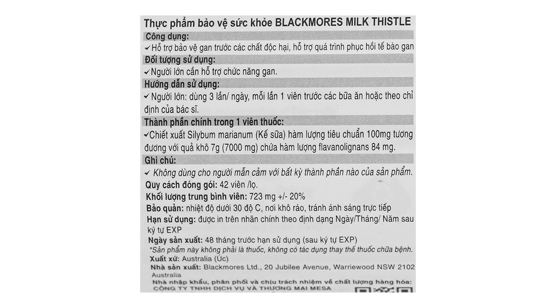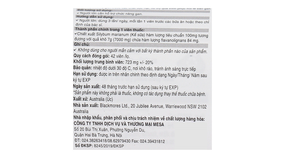 Blackmores Milk Thistle bảo vệ gan, hỗ trợ quá trình phục hồi gan lọ 42 viên