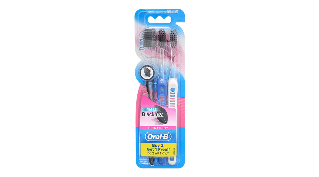 Bàn chải Oral-B trà đen vỉ 3 cây có chứa tinh chất trà đen và màu đen đặc trưng giúp hỗ trợ giúp kháng khuẩn và diệt mùi tối ưu