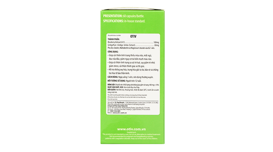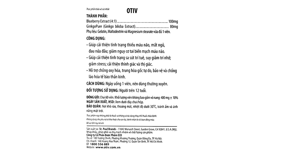 - OTiV là thực phẩm bảo vệ sức khỏe, với thành phần chính là bộ đôi tinh chất thiên nhiên quý là Blueberry và Ginkgo Biloba được chứng minh có khả năng vượt qua hàng rào máu não, có tác dụng hoạt huyết, trung hòa gốc tự do, bảo vệ và chống lão hóa tế bào thần kinh. Nhờ đó OTiV có thể hỗ trợ giảm đau đầu, chóng mặt, mất ngủ, thiếu máu não, giảm nguy cơ đột quỵ; đồng thời cũng hỗ trợ tình trạng sa sút trí tuệ, giảm trí nhớ, stress căng thẳng kéo dài đồng thời duy trì, hỗ trợ khả năng thính giác và thị giác.