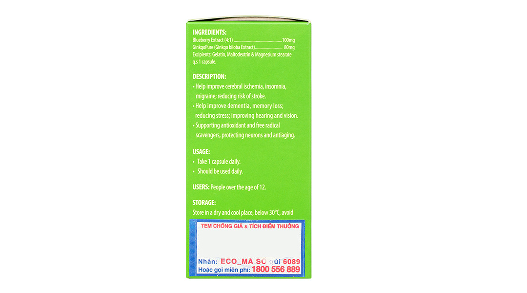 - Ginkgo Biloba: Cao chiết Bạch quả, có chứa hàm lượng Flavonoid và Terpenoid – 2 chất chống oxy hóa mạnh mẽ, giúp chống gốc tự do, đồng thời hỗ trợ lưu thông máu, tăng tuần hoàn não, bảo vệ tế bào, ngăn chặn kết tập tiểu cầu hình thành cục máu đông, giúp đưa oxy và các dưỡng chất lên não dễ dàng hơn. Nhờ đó, hỗ trợ cải thiện và phòng ngừa đau đầu, mất ngủ, giúp tăng cường trí nhớ, phòng đột quỵ và tai biến mạch máu não.