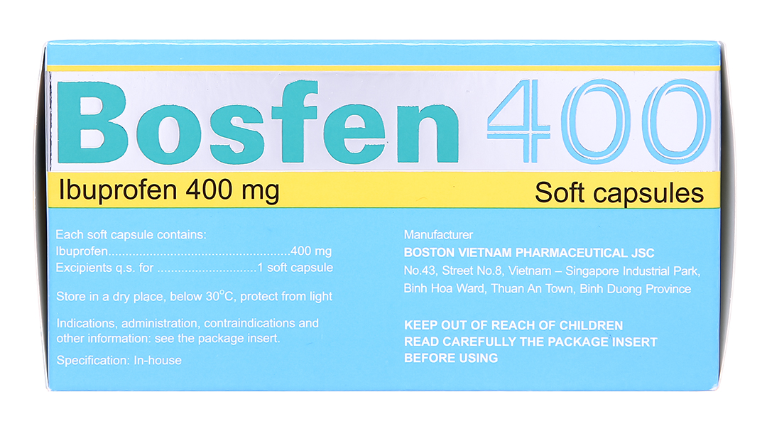 – Thận trọng khi sử dụngĐể giảm thiểu nguy cơ xuất hiện các biến cố bất lợi, cần sử dụng Bosfen 400 ở liều hàng ngày thấp nhất có hiệu quả trong thời gian ngắn nhất có thể. Cần tránh dùng chung ibuprofen với các NSAID dùng toàn thân khác, kể cả thuốc ức chế chọn lọc cyclooxygenase – 2, do làm tăng nguy cơ loét hoặc xuất huyết tiêu hóa. Người cao tuổi: – Tần suất tác dụng phụ với các NSAID tăng cao ở người cao tuổi, đặc biệt là thủng và xuất huyết đường tiêu hóa có thể dẫn đến tử vong. Do đó, cần thận trọng khi dùng ibuprofen ở người cao tuổi. Xuất huyết, loét hoặc thủng đường tiêu hóa: – Xuất huyết tiêu hóa, loét hoặc thủng đường tiêu hóa đã được ghi nhận đối với tất cả các NSAID. Chúng có thể xảy ra bất cứ lúc nào trong quá trình điều trị mà không cần dấu hiệu cảnh báo trước hay có tiền sử biến chứng trên đường tiêu hóa. – Nguy cơ biến chứng trên đường tiêu hóa cao hơn khi tăng liều NSAID, ở bệnh nhân bị loét, đặc biệt là kèm theo xuất huyết hoặc thủng đường tiêu hóa, và người già. Việc sử dụng liều thấp nhất có thể và phối hợp thêm các tác nhân bảo vệ (như misoprostol hoặc thuốc ức chế bơm proton) nên được cân nhắc ở những bệnh nhân này. – Cần thận trọng khi dùng NSAID ở những người đang sử dụng các thuốc làm tăng nguy cơ loét hay xuất huyết tiêu hóa như corticoid đường uống, thuốc chống đông máu (như warfarin), thuốc ức chế tái hấp thu chọn lọc serotonin (SSRI), thuốc ức chế kết tập tiểu cầu (như aspirin). – Cần thận trọng và giám sát chặt chẽ ở những bệnh nhân viêm loét đại tràng hoặc mắc bệnh Crohn do có thể làm tình trạng bệnh trở nên trầm trọng hơn. – Nếu loét hoặc xuất huyết xảy ra, nên ngưng việc điều trị với Bosfen 400 ngay lập tức. Nguy cơ huyết khối tim mạch: – Các thuốc NSAID dùng đường toàn thân, không phải aspirin, có thể làm tăng nguy cơ xuất hiện biến cố huyết khối tim mạch, bao gồm cả nhồi máu cơ tim và đột quỵ, có thể dẫn đến tử vong. Nguy cơ này có thể xuất hiện sớm trong vòng vài tuần đầu và có thể tăng lên theo thời gian dùng thuốc. Nguy cơ huyết khối tim mạch được ghi nhận chủ yếu ở liều cao. – Bác sĩ cần đánh giá định kỳ sự xuất hiện của các biến cố tim mạch, ngay cả khi bệnh nhân không có các triệu chứng tim mạch trước đó. Bệnh nhân cần được cảnh báo về các triệu chứng của biến cố tim mạch nghiêm trọng và cần thăm khám bác sĩ ngay khi xuất hiện các triệu chứng này. Rối loạn hô hấp và các phản ứng quá mẫn: – Cần thận trọng khi dùng ibuprofen cho bệnh nhân đang bị hoặc có tiền sử hen phế quản, viêm mũi mạn tính hoặc các bệnh dị ứng khác do co thắt phế quản, nổi mày đay, phù mạch đã được ghi nhận khi sử dụng NSAID ở những bệnh nhân này. Bệnh suy tim, suy gan và suy thận: – Việc sử dụng NSAID và các thuốc giảm đau có tác dụng làm giảm sự tạo thành prostaglandin và có thể gây suy thận. Những người có nguy cơ cao bao gồm bệnh nhân suy thận, suy tim, người già và người đang sử dụng các thuốc lợi tiểu. Ở những bệnh nhân này, cần sử dụng liều thấp nhất có hiệu quả trong thời gian ngắn nhất có thể và phải theo dõi định kỳ chức năng thận, đặc biệt là bệnh nhân điều trị dài hạn. Bệnh lupus ban đỏ hệ thống và rối loạn mô liên kết hỗn hợp: – Ở những bệnh nhân lupus ban đỏ hệ thống (SLE) và rối loạn mô liên kết hỗn hợp, nguy cơ viêm màng não vô khuẩn có thể tăng lên khi sử dụng ibuprofen. Da liễu: – Các phản ứng da nghiêm trọng có thể gây tử vong, như viêm da tróc vẩy, hội chứng Stevens – Johnson và hoại tử da nhiễm độc đã được ghi nhận có liên quan đến việc sử dụng các NSAID, mặc dù rất hiếm. Trong đa số các trường hợp, phản ứng khởi phát ngay trong tháng đầu tiên sau khi điều trị. Nên ngưng sử dụng thuốc khi xuất hiện các triệu chứng như phát ban, tổn thương niêm mạc hoặc bất kỳ dấu hiệu quá mẫn khác. Suy giảm chức năng sinh sản ở nữ: – Ibuprofen có thể làm suy giảm khả năng sinh sản ở nữ giới và do đó không được khuyến cáo sử dụng ở bệnh nhân mong muốn thụ thai. Ở những phụ nữ được chẩn đoán là khó thụ thai hoặc đang điều trị vô sinh, việc sử dụng Bosfen 400 nên được cân nhắc. – Thai kỳ và cho con búPhụ nữ có thai: Ibuprofen có thể ức chế co bóp tử cung và làm chậm đẻ. Ibuprofen cũng có thể gây tăng áp lực phổi nặng và suy hô hấp nặng ở trẻ sơ sinh do đóng sớm ống động mạch trong tử cung. Ibuprofen ức chế chức năng tiểu cầu, làm tăng nguy cơ chảy máu. Do ức chế tổng hợp prostaglandin nên có thể gây tác dụng phụ trên hệ tim mạch của thai. Sau khi uống các thuốc chống viêm không steroid cũng có nguy cơ gây ít nước ối và vô niệu ở trẻ sơ sinh. Trong 3 tháng cuối thai kỳ, phải hết sức hạn chế sử dụng đối với bất cứ thuốc chống viêm nào. Các thuốc này chống chỉ