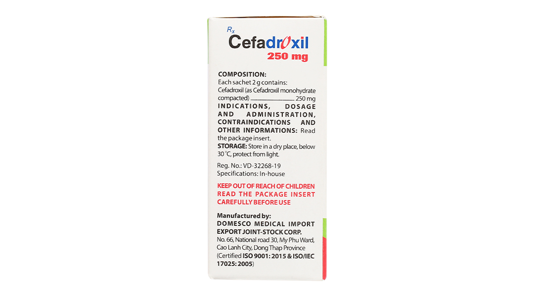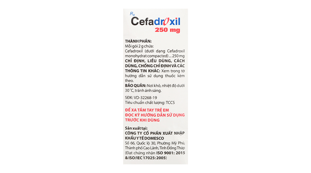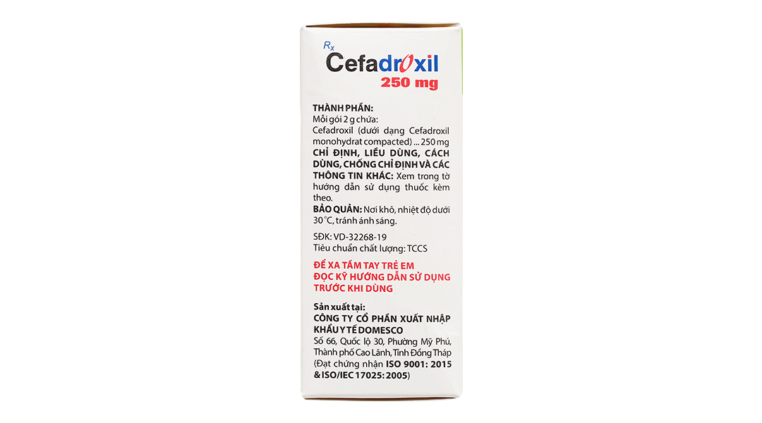 Thành phần dược chất: Cefadroxil (dưới dạng Cefadroxil monohydrate compacted) 250 mg.