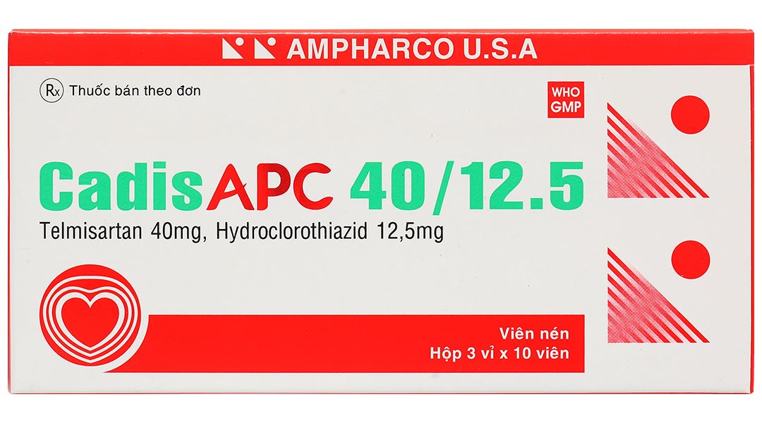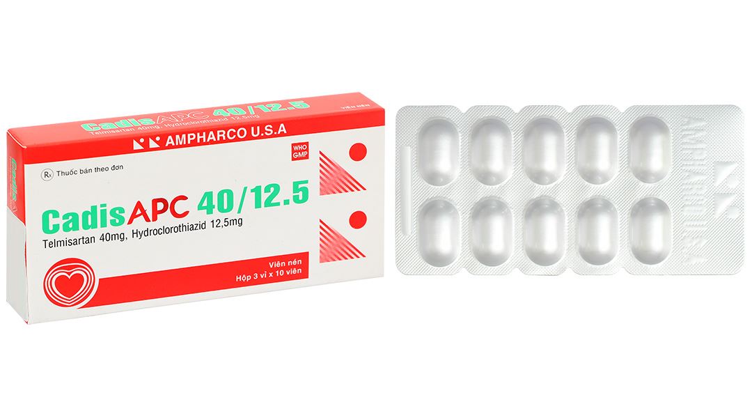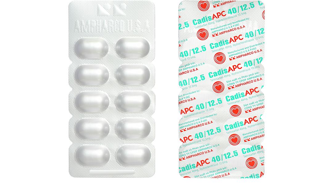 - CadisAPC 40/12.5 là thuốc kết hợp telmisartan, một chất đối kháng thụ thể angiotensin II và hydroclorothiazid, một thuốc lợi tiểu thiazid. Viên phối hợp của 2 chất này có tác dụng hạ huyết áp cộng thêm, hạ huyết áp nhiều hơn so với khi dùng riêng lẻ. Dùng CadisAPC 40/12.5 mỗi ngày làm tăng hiệu quả hạ huyết áp trong phạm vi liều điều trị.