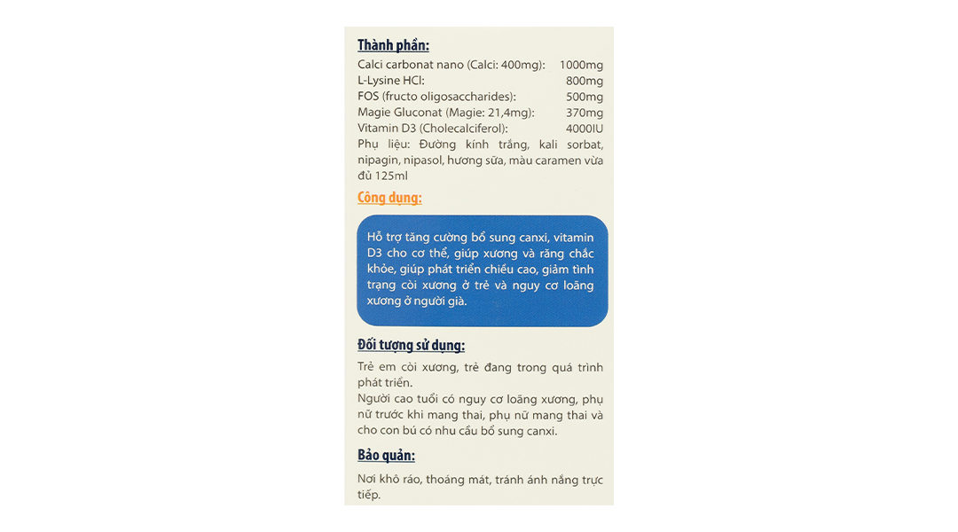 Hoạt chấtL-Lysine HCL, Calci carbonat nano (Calci: 400mg), Magie Gluconat (Magie: 21,4mg), FOS (fructo oligosaccharides), Vitamin D3 (Cholecalciferol)