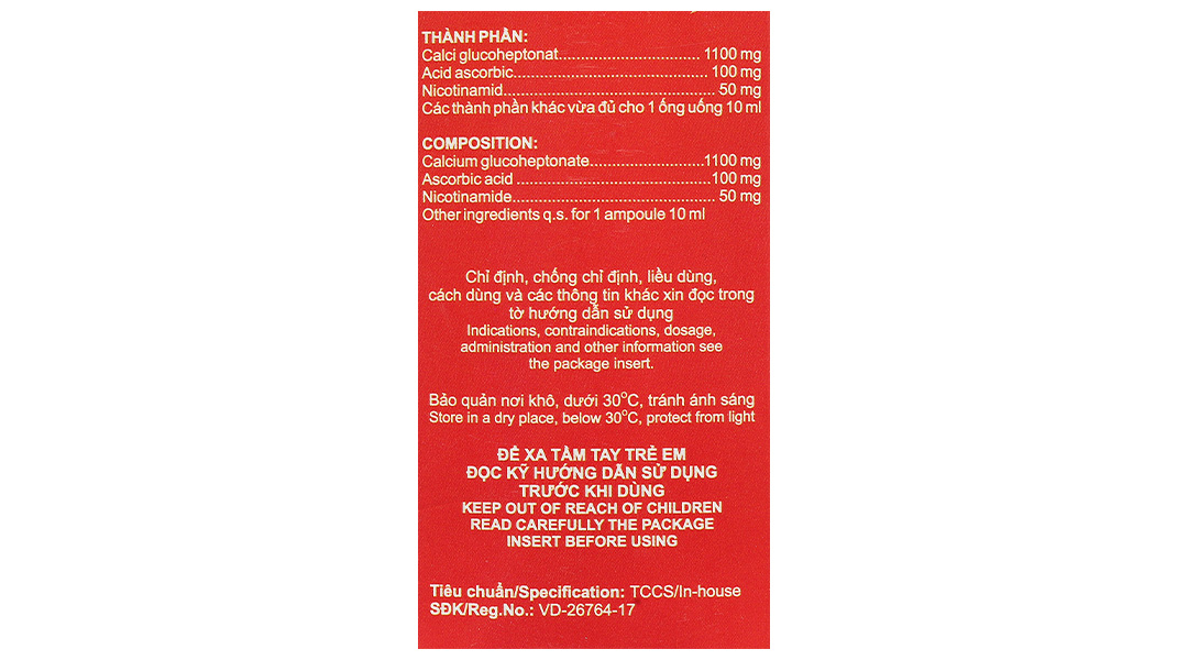 - Tá dược: Acid hypophosphorous, đường RE, natri sulfit, polysorbat 80, tinh dầu chanh, natri hydroxyd, ethanol 96%, nước tinh khiết vừa đủ 1 ml.
