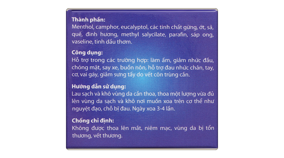 Menthol, camphor, eucalyptol, các tinh chất gừng, ớt, sả, quế, đinh hương, methyl salicylate, parafin, sáp ong, vaseline, tinh dầu thơm.
