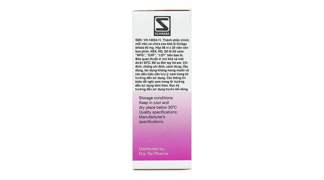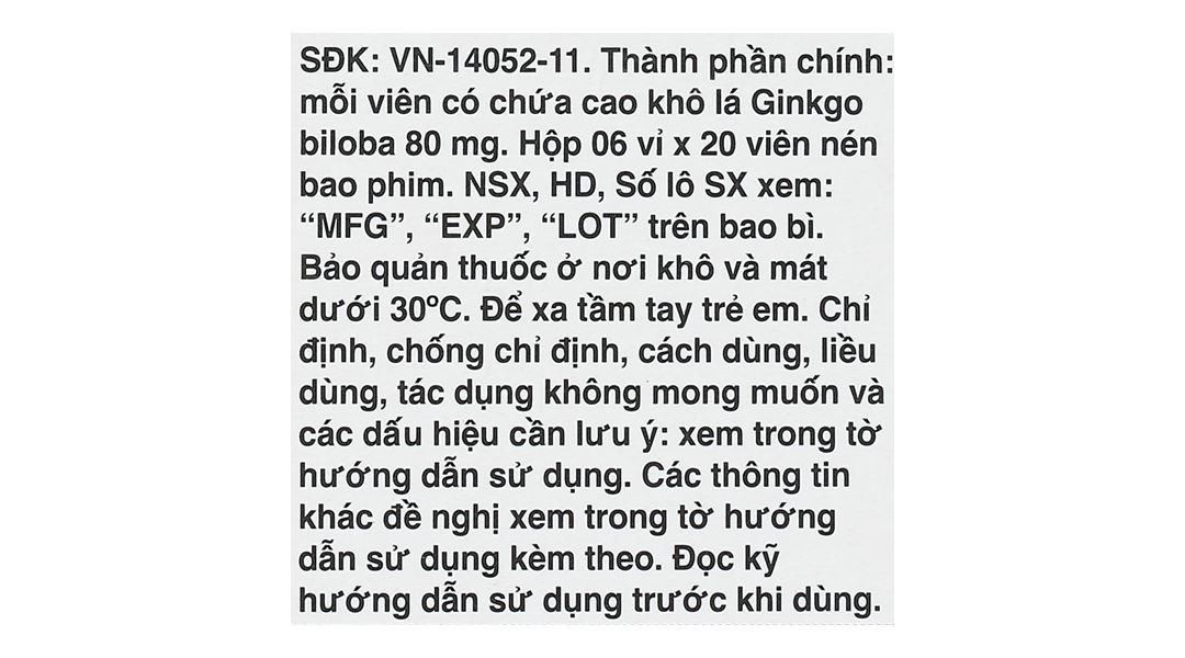 - Thành phần hoạt chất: Cao khô lá Ginkgo biloba 80 mg, được tiêu chuẩn hóa để đạt 19,2mg Ginkgo flavone glycoside và 4,8mg Terpenlactone (Ginkgolide, Bilobalide).