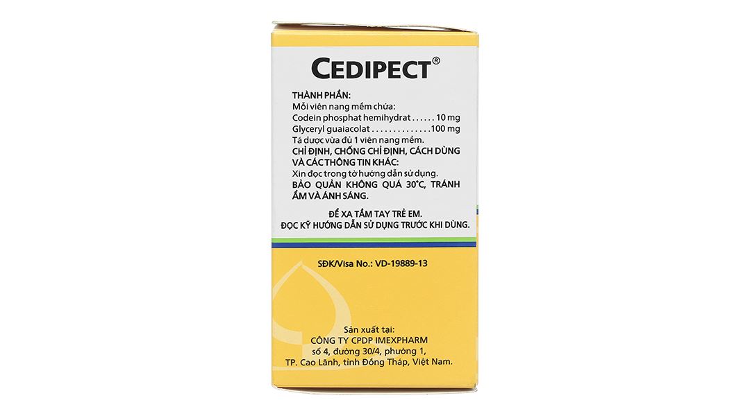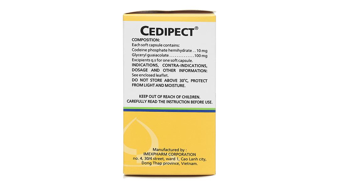 Bệnh nhân suy giảm chức năng hô hấp: Codein không được khuyến cáo sử dụng ở những trẻ em có suy giảm chức năng hô hấp, bao gồm rối loạn thần kinh cơ, bệnh lý nặng về tim hoặc hỗ hấp, nhiễm trùng đường hô hấp trên và phổi, đa chấn thương hay vừa trải qua phẫu thuật lớn. Các yếu tố này có thể làm trầm trọng hơn các triệu chứng của ngộ độc morphin. – Thai kỳ và cho con búCedipect không được khuyến cáo dùng cho phụ nữ đang cho con bú (xem phần Chống chỉ định). Ở liều điều trị thông thường, codein và chất chuyển hóa có hoạt tính có thể có mặt trong sữa mẹ ở liều rất thấp và dường như không gây ảnh hưởng bất lợi đến trẻ bú mẹ. Tuy nhiên, nếu bệnh nhân là người mang gen chuyển hóa thuốc qua CYP2D6 siêu nhanh, morphin (chất chuyển hóa có hoạt tính của codein) có thể có trong sữa mẹ với nồng độ cao hơn và trong những trường hợp rất hiếm gặp, có thể dẫn đến các triệu chứng ngộ độc opioid ở trẻ sơ sinh, có thể gây tử vong. – Khả năng lái xe và vận hành máy mócThuốc gây buồn ngủ, nôn và buồn nôn, vì vậy nên đặc biệt thận trọng đối với các bệnh nhân đang vận hành tàu xe, máy móc. – Tương tác thuốcKhông dùng rượu trong thời gian điều trị. Thận trọng khi phối hợp với phenothiazin, barbiturat, benzodiazepin, IMAO, thuốc chống trầm cảm 3 vòng, các dẫn xuất khác của morphin. Codein làm giảm chuyển hóa cyclosporin do ức chế men cytochrom P450. |