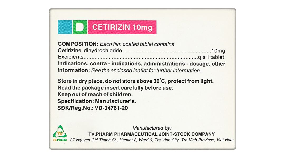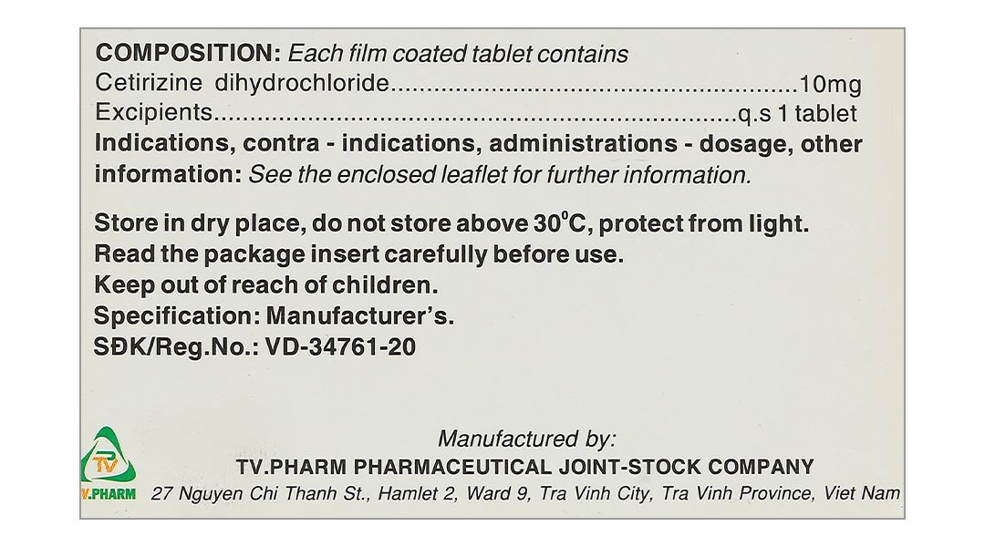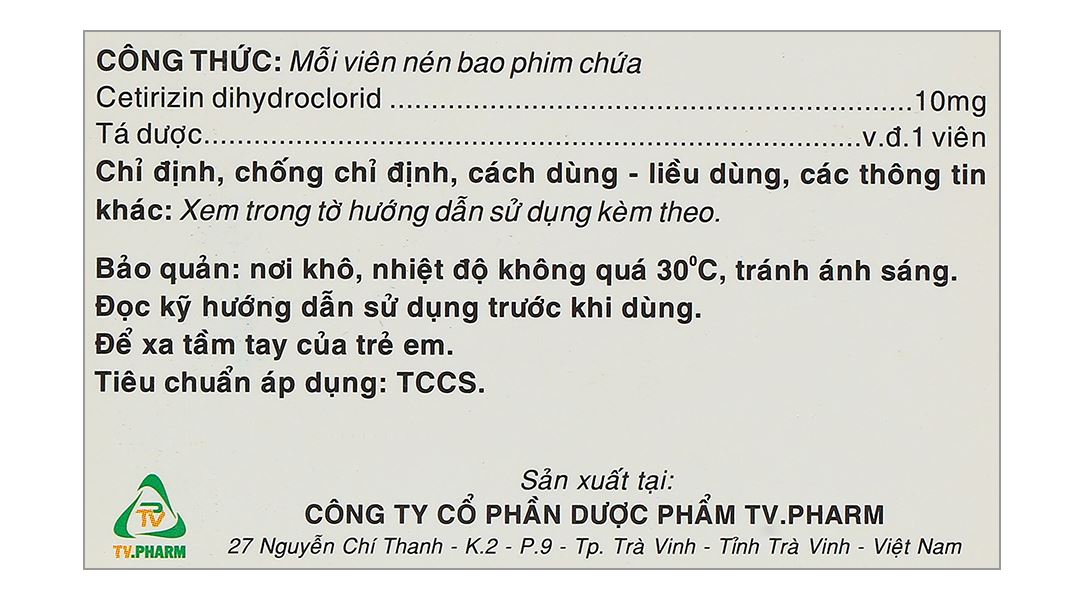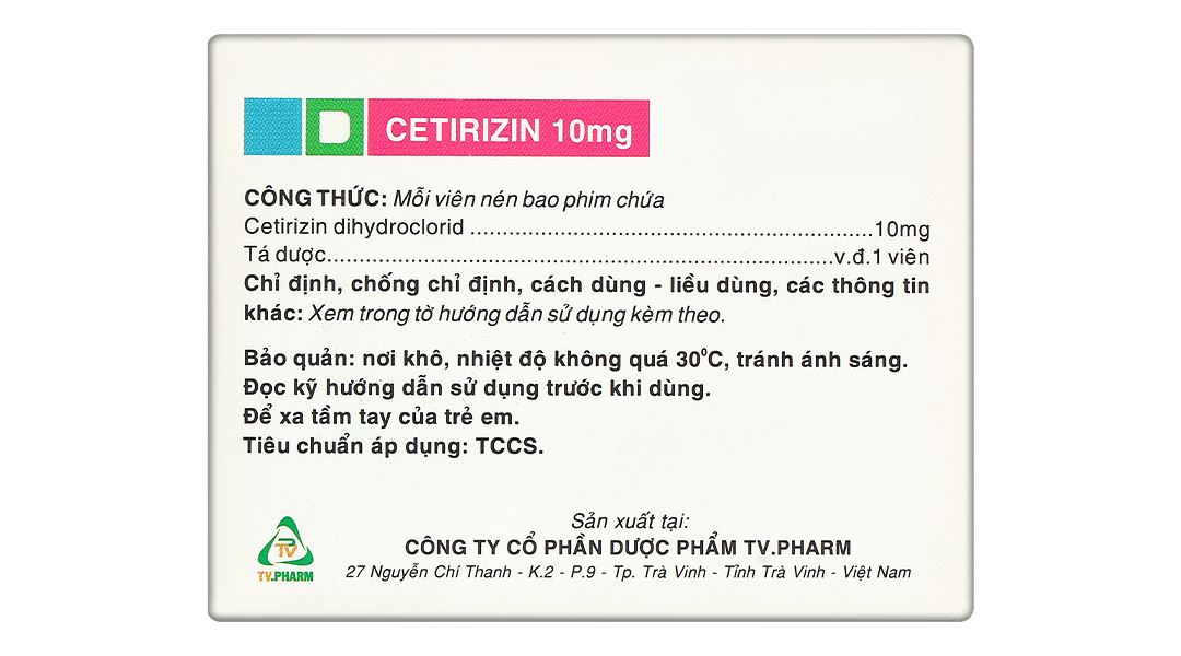 Thành phần dược chất: Cetirizin dihydroclorid 10mg.