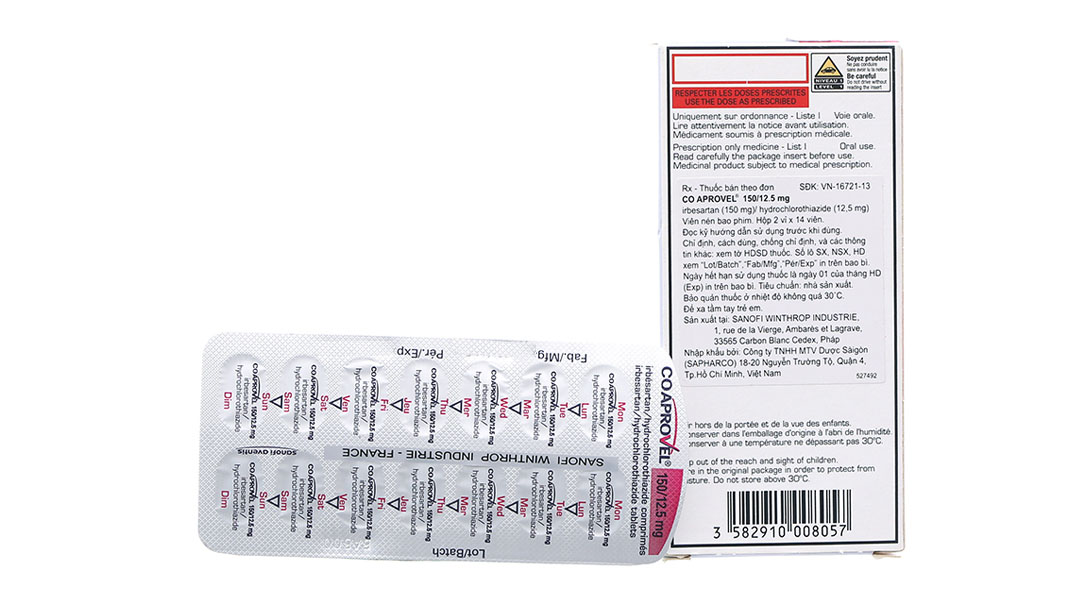 CoAprovel 150/12.5mg sử dụng phối hợp trong trị tăng huyết áp (2 vỉ x 14 viên)