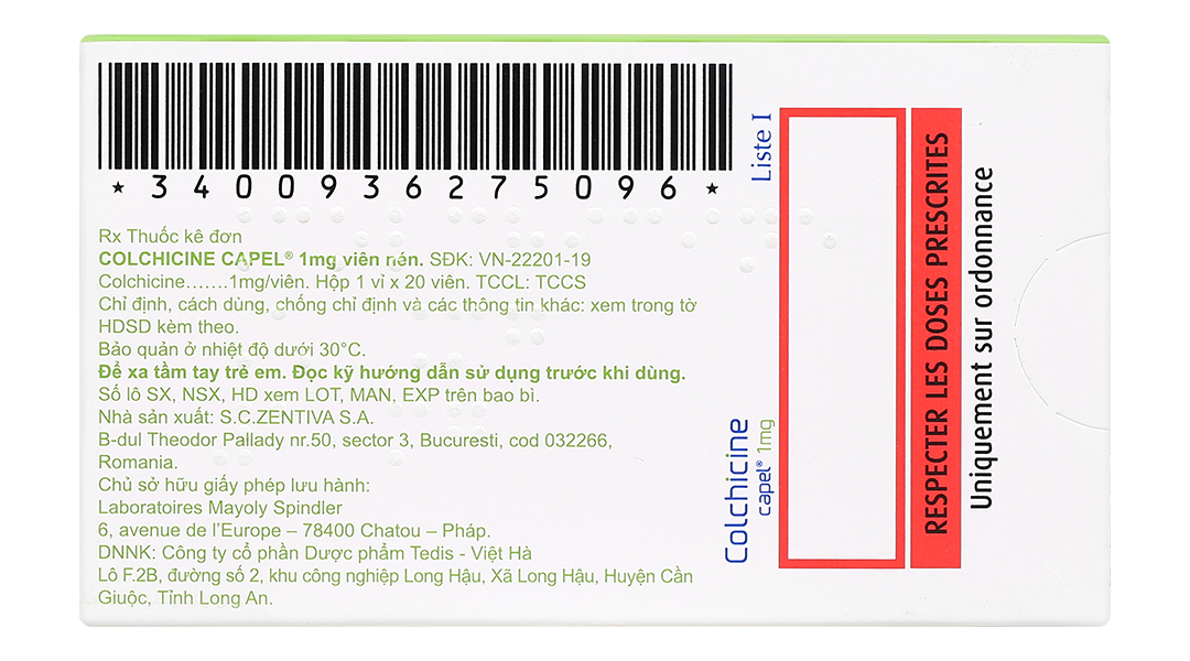 Colchicine Capel Mayoly Spindler 1mg phòng và trị cơn gout cấp (1 vỉ x 20 viên)