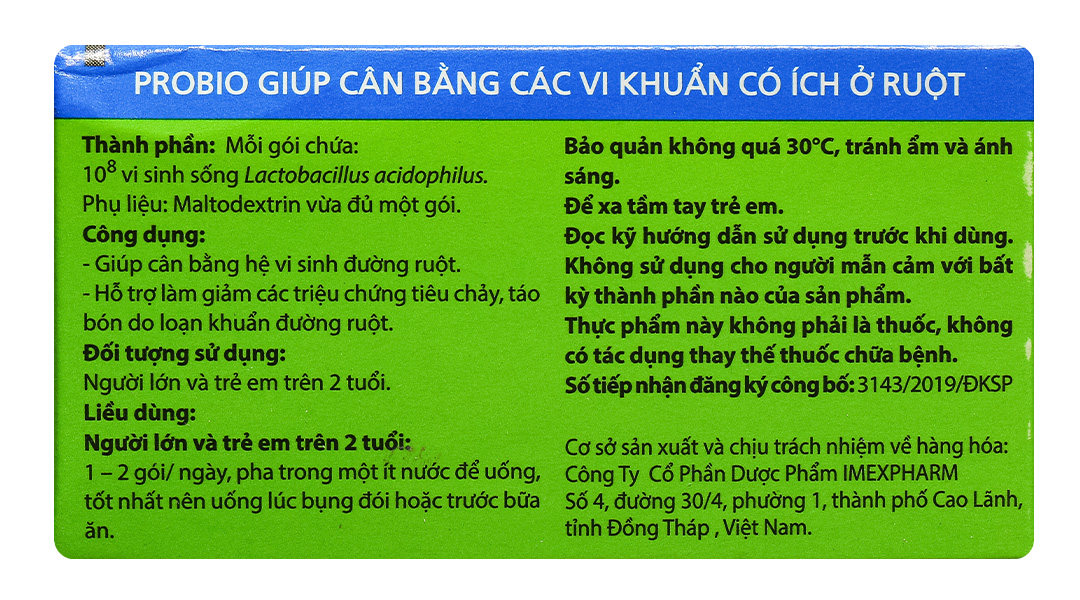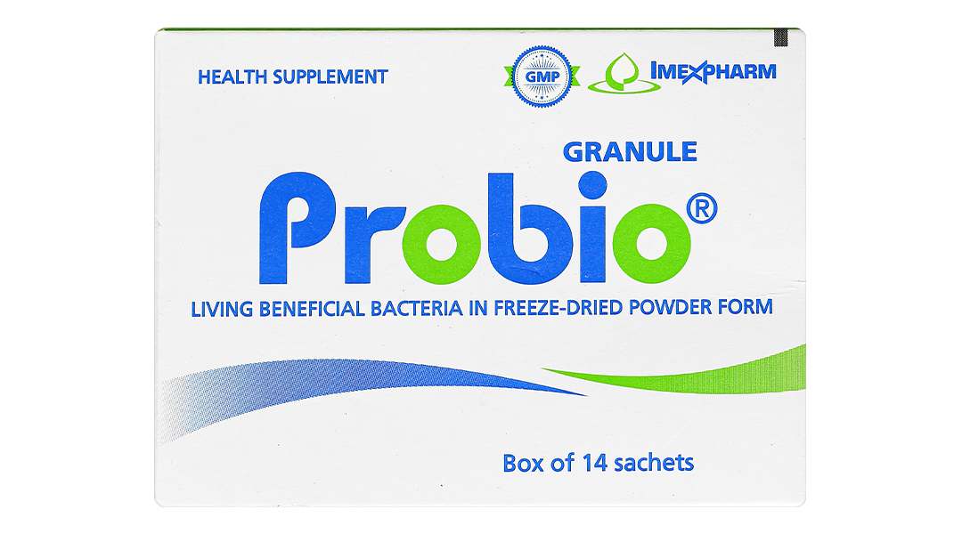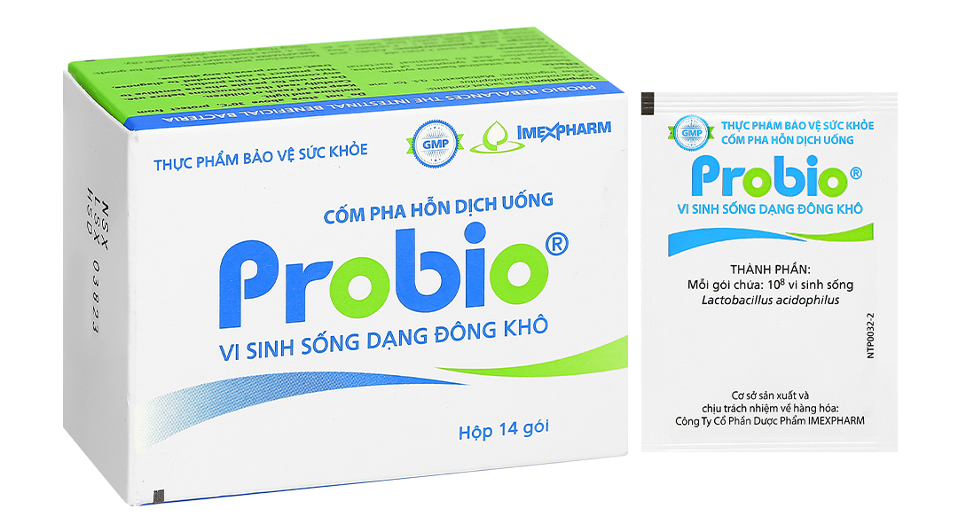 - Cốm pha hỗn dịch uống Probio là thực phẩm bảo vệ sức khỏe giúp cân bằng hệ vi sinh đường ruột. Sản phẩm có chứa vi khuẩn sống Lactobacillus acidophilus có lợi cho hệ tiêu hóa. Mỗi hộp sản phẩm chứa 14 gói, tiện lợi cho việc sử dụng hàng ngày.