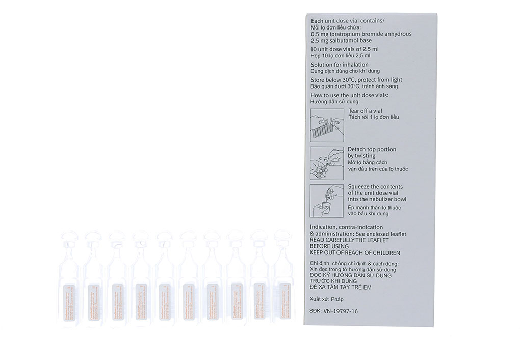 Hoạt chất: (8r)-3α-hydroxy-8-isopropyl-1aH, 5αH-tropanium bromide(±)-tropate monohydrate (= ipratropium bromid) 520mcg tương ứng với 0.5mg ipratropium bromid dạng khan, di[(RS)-2-tert-butylamino-1-(4-hydroxy-3-hydroxymethyl-phenyl)ethanol] sulphate (= salbutamol sulfat) 3010mcg tương ứng với 2.5mg salbutamol dạng bazơ.