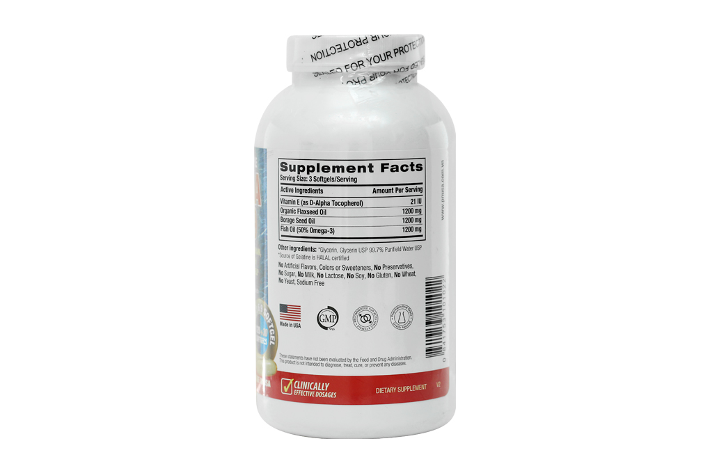Fish Oil (50% Omega 3) 1200mg, Dầu lưu ly (Borage Seed Oil) 1200mg, Tinh dầu lưu ly hữu cơ (Organic Flaxseed Oil) 1200mg, Vitamin E (as D-Alpha Tocopherol) 21IU.