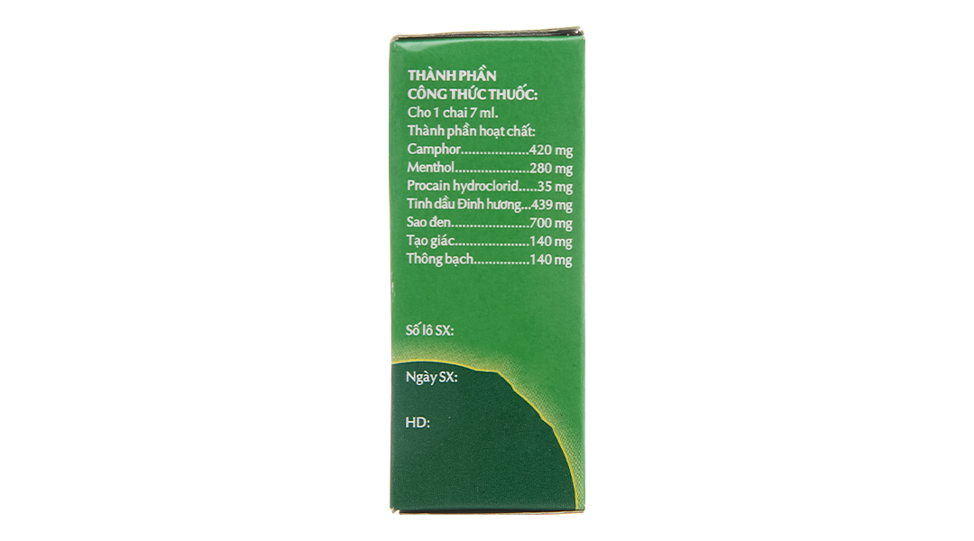 Hoạt chấtSao đen, Tạo giác, Tinh dầu Đinh hương, Camphor, Thông Bạch, Menthol, Procain hydroclorid
