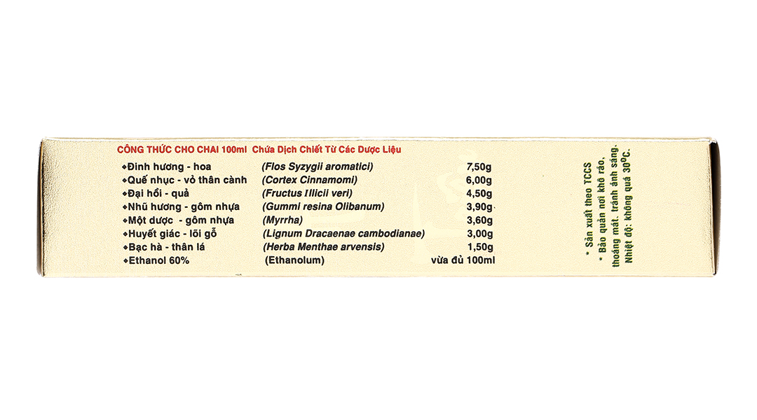 Công thức cho chai 100ml chứa dịch chiết từ các dược liệu: Đinh hương – hoa (Flos Syzygii aromatici) 7,50g, Quế nhục – vỏ thân cành (Cortex Cinnamomi) 6,00g, Đại hồi – quả (Fructus Illicii veri) 4,50g, Nhũ hương – gôm nhựa (Gummi resina Olibanum) 3,90g, Một dược – gôm nhựa (Myrrha) 3,60g, Huyết giác – lõi gỗ (Lignum Dracaenae cambodianae) 3,00g, Bạc hà – thân lá (Herba Menthae arvensis) 1,50g, Ethanol 60% (Ethanolum) vừa đủ 100ml.