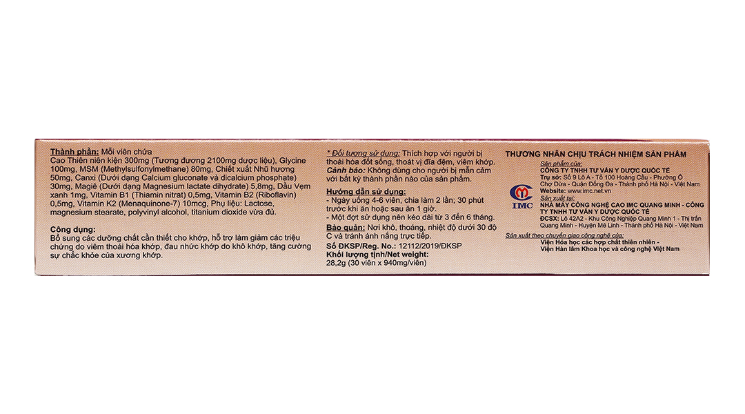 Cao Thiên niên kiện 300 mg (Tương đương 2100 mg dược liệu), Glycine 100 mg, MSM (Methylsulfonylmethane) 80 mg, Chiết xuất Nhũ hương 50 mg, Canxi (Dưới dạng Calcium gluconate và dicalcium phosphate) 30 mg, Magiê (Dưới dạng Magnesium lactate dihydrate) 5,8 mg, Dầu Vẹm xanh 1 mg, Vitamin B1 (Thiamin nitrat) 0,5 mg, Vitamin B2 (Riboflavin) 0,5 mg, Vitamin K2 (Menaquinone – 7) 10 mcg.