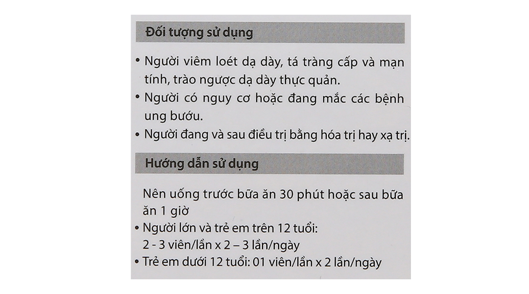 Đối tượng sử dụngNgười viêm loét dạ dày, tá tràng cấp và mạn tính, trào ngược dạ dày thực quản