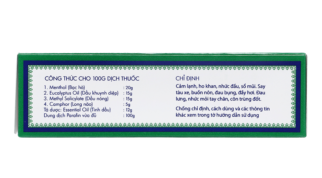 Hoạt chất: Menthol (Bạc hà) 20g, Eucalyptus Oil (Dầu khuynh diệp) 15g, Methyl Salicylate 15g, Camphor (Long não) 5g.