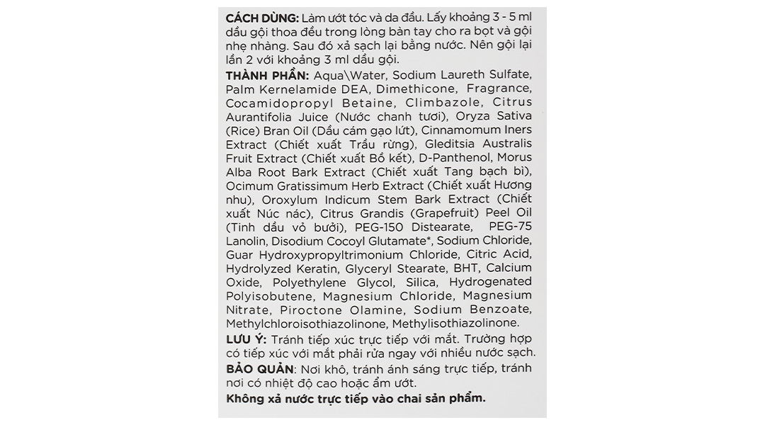 Thành phầnPalm Kernelamide DEA, Dimethicone, Fragrance, Cocamidopropyl Betaine, Climbazole, Nước chanh tươi, Dầu cám gạo lứt, Chiết xuất Trâu rừng, Chiết xuất Bồ kết, D-Panthenol, Chiết xuất Tang bạch bì, Chiết xuất Hương nhu, Chiết xuất Núc nác, Citrus Grandis (Grapefruit) Peel Oil Tinh dầu vỏ bưởi, PEG-150 Distearate, PEG-75 Lanolin, Disodium Cocoyl Glutamate, Sodium Chloride, Guar Hydroxypropyltrimonium Chloride, Citric Acid, Hydrolyzed Keratin, Glyceryl Stearate, BHT, Calcium Oxide, Polyethylene Glycol, Silica, Hydrogenated Polyisobutene, Magnesium Chloride, Magnesium Nitrate, Piroctone Olamine, Sodium Benzoate, Methylchloroisothiazolinone, Methylisothiazolinone.