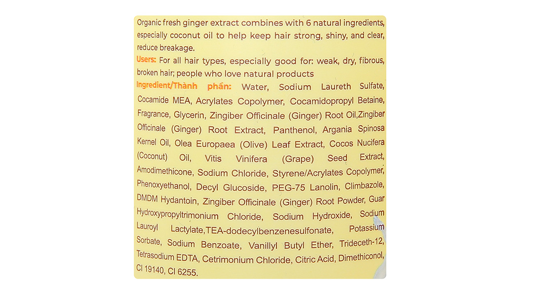 Nước, Sodium Laureth Sulfate, Cocamide MEA, Acrylates Copolymer, Cocamidopropyl Betaine, Fragrance, Glycerin, Zingiber Officinale (Ginger) Root Oil (tinh dầu gừng), Zingiber Officinale (Ginger) Root Extract, Panthenol (vitamin B5), Argania Spinosa Kernel Oil (dầu Argan), Olea Europaea (Oliu) Leaf Extract (chiết xuất lá Oliu), Cocos Nucifera (Coconut) Oil (dầu Dừa), Vitis Vinifera (Grape) Seed Extract (chiết xuất hạt Nho), Amodimethicone, Sodium Chloride, Styrene/Acrylates Copolymer, Phenoxyethanol, Decyl Glucoside, PEG-75 Lanolin, DMDM Hydantoin, Climbazole, Zingiber Officinale (Ginger) Root Powder (Xác gừng), Guar Hydroxypropyltrimonium Chloride, Sodium Hydroxide, Sodium Lauroy| Lactylate, TEA-dodecylben-zenesulfonate, Potassium Sorbate, Sodium Benzoate, Vanily Butyl Ether, Trideceth-12, Tetrasodium EDTA, Cetrimonium Chloride, Citric Acid, Dimethiconol, CI 19140, CI 6255.