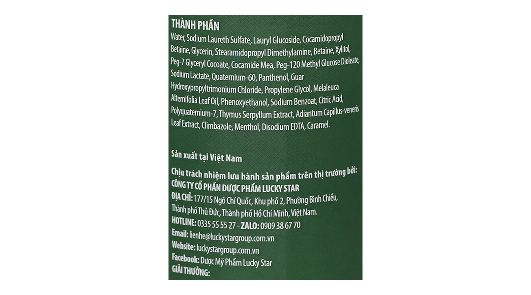 Water, Sodium Laureth Sulfate, Lauryl Glucoside, Cocamidopropyl Betaine, Glycerin, Stearamidopropyl Dimethylamine, Betaine, Xylitol, Peg-7 Glyceryl Cocoate, Cocamide Mea, Peg-120 Methyl Glucose Dioleate, Sodium Lactate, Quaternium-60, Panthenol, Guar Hydroxypropyltrimonium Chloride, Propylene Glycol, Melaleuca Alternifolia Leaf Oil, Phenoxyethanol, Sodium Benzoate, Citric Acid, Polyquaternium-7, Thymus Serpyllum Extract, Adiantum Capillus-veneris Leaf Extract, Climbazole, Menthol, Disodium EDTA, Caramel.